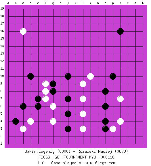 Last move : 1-0 2011 June 3 7:7:32 [Event "FICGS__GO__TOURNAMENT_KYU__000118"] [Site "FICGS"] [Date "2011.02.23"] [Round "1"] [Black "Bakin,Eugeniy"] [White "Rozalski,Maciej"] [Result "1-0"] [Rating 1 "0000"] [Rating 2 "0679"] 1.q16 d4 2.c6 q4 3.b4 c3 4.e6 g4 5.d10 c16 6.o3 p3 7.o4 l3 8.j3 l5 9.j5 g6 10.j7 l7 11.o6 q7 12.o8 l9 13.g8 f7 14.e7 f8 15.g9 f9 16.j10 m10 17.p10 1-0 This go game has been lost on time (started : 2011.02.23 15:43:26) Here are the names of the openings (joseki) played in the four corners : Corner d4 : d4 c6 Hoshi (Hwajeom, Seongjeom, Xingwei`) 4-4 Point. The star or hoshi (4-4) point, emphasizing influence at the potential expense of territory. Ikken Kakari (Hankan Keolch'im, Yi Gua`jiao~, 1-Space Low Approach). Black 2 is the standard approach move to the 4-4. Corner q4 : q4 o3 Hoshi (Hwajeom, Seongjeom, Xingwei`) 4-4 Point. The star or hoshi (4-4) point, emphasizing influence at the potential expense of territory. Ikken Kakari (Hankan Keolch'im, Yi Gua`jiao~, 1-Space Low Approach). Black 2 is the standard approach move to the 4-4. Player Black won this Go (weiqi, baduk) game. Follow this game move after move (download)If you have lost four corners, resign. (Anonymous) Every now and then a man's mind is stretched by a new idea and never shrinks back to its former dimensions. (Oliver Wendell Holmes, Sr.)