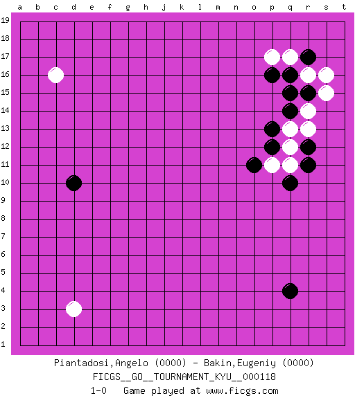 Last move : 1-0 2011 May 7 5:37:28 [Event "FICGS__GO__TOURNAMENT_KYU__000118"] [Site "FICGS"] [Date "2011.02.23"] [Round "1"] [Black "Piantadosi,Angelo"] [White "Bakin,Eugeniy"] [Result "1-0"] [Rating 1 "0000"] [Rating 2 "0000"] 1.q16 c16 2.q4 d3 3.q10 r14 4.q14 q17 5.r17 p17 6.p16 r16 7.r15 s16 8.d10 s15 9.q15 r13 10.r12 q13 11.p13 q12 12.r11 p11 13.p12 q11 14.o11 1-0 This go game has been lost on time (started : 2011.02.23 15:43:26) Here are the names of the openings (joseki) played in the four corners : Corner q16 : q16 r14 Hoshi (Hwajeom, Seongjeom, Xingwei`) 4-4 Point. The star or hoshi (4-4) point, emphasizing influence at the potential expense of territory. Ikken Kakari (Hankan Keolch'im, Yi Gua`jiao~, 1-Space Low Approach). White 2 is the standard approach move to the 4-4. Corner q4 : q4 1-0 Hoshi (Hwajeom, Seongjeom, Xingwei`) 4-4 Point. The star or hoshi (4-4) point, emphasizing influence at the potential expense of territory. Player Black won this Go (weiqi, baduk) game. Follow this game move after move (download)While the Baroque rules of chess could only have been created by humans, the rules of go are so elegant, organic, and rigorously logical that if intelligent life forms exist elsewhere in the universe, they almost certainly play go. (Edward Lasker, international chess master) He is a liar. I just don't know what the lie is yet. (Horatio Caine, C.S.I. Miami)