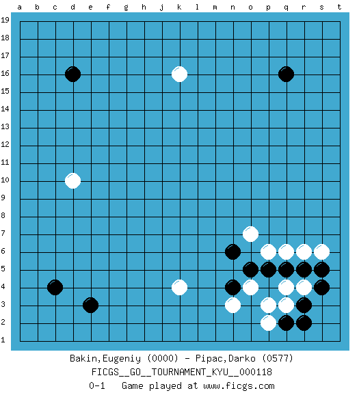 Last move : 0-1 2011 May 13 18:10:29 [Event "FICGS__GO__TOURNAMENT_KYU__000118"] [Site "FICGS"] [Date "2011.02.23"] [Round "1"] [Black "Bakin,Eugeniy"] [White "Pipac,Darko"] [Result "0-1"] [Rating 1 "0000"] [Rating 2 "0577"] 1.q16 d10 2.c4 k4 3.e3 p3 4.q5 k16 5.d16 q6 6.r5 r6 7.r3 q3 8.q2 p2 9.r2 q4 10.p5 r4 11.s4 s6 12.s5 p6 13.o5 o4 14.n4 n3 15.n6 o7 0-1 This go game has been lost on time (started : 2011.02.23 15:43:26) Here are the names of the openings (joseki) played in the four corners : Corner q4 : p3 q5 Mokuhazushi (Waemok, Wai`mu`) 5-3 Point. The mokuhazushi (5-3) point was popular in the Edo period in Japan (1600 - 1867). It emphasizes influence; territorially, it is inferior to the 3-4 point. Takamoku Kakari. Black prevents White from gaining influence, but in the local context, abandoning profit in the corner entails a loss. White 3-4 and 4-4 are best. Player White won this Go (weiqi, baduk) game. Follow this game move after move (download)At the head of two stones in a row, play hane. (Anonymous) Being number two sucks. (Andre Agassi)
