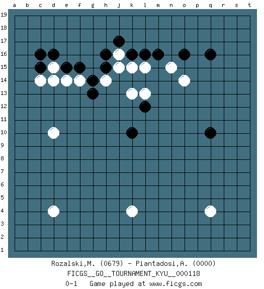 Last move : 0-1 2011 May 7 5:37:28 [Event "FICGS__GO__TOURNAMENT_KYU__000118"] [Site "FICGS"] [Date "2011.02.23"] [Round "1"] [Black "Rozalski,Maciej"] [White "Piantadosi,Angelo"] [Result "0-1"] [Rating 1 "0679"] [Rating 2 "0000"] 1.q16 d4 2.d16 q4 3.k16 k4 4.k10 d10 5.q10 c14 6.c15 d14 7.e15 d15 8.c16 e14 9.f15 k13 10.l12 l13 11.g13 h14 12.g14 f14 13.h15 j15 14.h16 j16 15.j17 k15 16.l16 l15 17.m16 o14 18.o16 n15 0-1 This go game has been lost on time (started : 2011.02.23 15:43:26) Here are the names of the openings (joseki) played in the four corners : Corner d16 : d16 c14 Hoshi (Hwajeom, Seongjeom, Xingwei`) 4-4 Point. The star or hoshi (4-4) point, emphasizing influence at the potential expense of territory. Ikken Kakari (Hankan Keolch'im, Yi Gua`jiao~, 1-Space Low Approach). White 2 is the standard approach move to the 4-4. Corner q4 : q4 0-1 Hoshi (Hwajeom, Seongjeom, Xingwei`) 4-4 Point. The star or hoshi (4-4) point, emphasizing influence at the potential expense of territory. Player White won this Go (weiqi, baduk) game. Follow this game move after move (download)Take the cutting stone on the second line. (Anonymous) Philosophers use a language that is already deformed as though by shoes that are too tight. (Ludwig Wittgenstein)