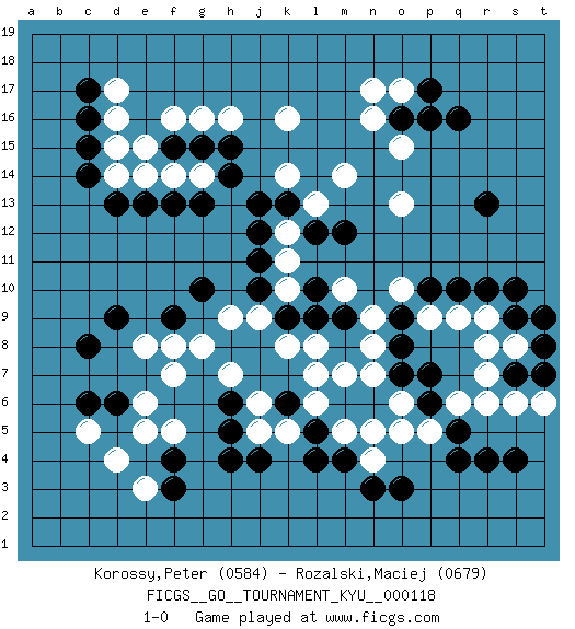Last move : 1-0 2011 May 22 18:42:5 [Event "FICGS__GO__TOURNAMENT_KYU__000118"] [Site "FICGS"] [Date "2011.02.23"] [Round "1"] [Black "Korossy,Peter"] [White "Rozalski,Maciej"] [Result "1-0"] [Rating 1 "0584"] [Rating 2 "0679"] 1.q16 d4 2.q4 d16 3.f3 e3 4.f4 e5 5.c6 c5 6.d6 f5 7.h4 f7 8.d9 e8 9.c8 e6 10.l4 k16 11.q10 k10 12.c14 d14 13.d13 e14 14.c17 d17 15.c16 o17 16.o16 n16 17.p17 n17 18.r13 o15 19.p16 o13 20.j11 k11 21.j12 k12 22.h14 h16 23.g10 g8 24.f9 f8 25.m9 l8 26.l9 k8 27.k9 j9 28.j10 h9 29.m12 m14 30.k13 l13 31.l12 k14 32.j13 j5 33.j4 k5 34.l5 l6 35.m6 m7 36.k6 l7 37.n6 n7 38.o7 n9 39.o8 n8 40.h5 j6 41.h6 h7 42.g15 g16 43.f15 f16 44.e13 f14 45.f13 g14 46.h15 e15 47.c15 d15 48.g13 r6 49.r4 r9 50.r10 q9 51.s7 r7 52.s9 s8 53.t8 r8 54.s10 p9 55.o9 o10 56.p10 o6 57.p6 o5 58.p7 p5 59.q5 q6 60.o3 m5 61.m4 n5 62.t7 s6 63.s4 n4 64.n3 t6 65.t9 m10 66.l10 1-0 Here are the names of the openings (joseki) played in the four corners : Corner d4 : d4 f3 Hoshi (Hwajeom, Seongjeom, Xingwei`) 4-4 Point. The star or hoshi (4-4) point, emphasizing influence at the potential expense of territory. Ikken Kakari (Hankan Keolch'im, Yi Gua`jiao~, 1-Space Low Approach). Black 2 is the standard approach move to the 4-4. Corner d16 : d16 c14 Hoshi (Hwajeom, Seongjeom, Xingwei`) 4-4 Point. The star or hoshi (4-4) point, emphasizing influence at the potential expense of territory. Ikken Kakari (Hankan Keolch'im, Yi Gua`jiao~, 1-Space Low Approach). Black 2 is the standard approach move to the 4-4. Corner q16 : q16 o17 Hoshi (Hwajeom, Seongjeom, Xingwei`) 4-4 Point. The star or hoshi (4-4) point, emphasizing influence at the potential expense of territory. Ikken Kakari (Hankan Keolch'im, Yi Gua`jiao~, 1-Space Low Approach). White 2 is the standard approach move to the 4-4. Player Black won this Go (weiqi, baduk) game. Follow this game move after move (download)The intersection is rarely neutral. (Pierre Audouard) Man is still the most extraordinary computer of all. (John F. Kennedy)