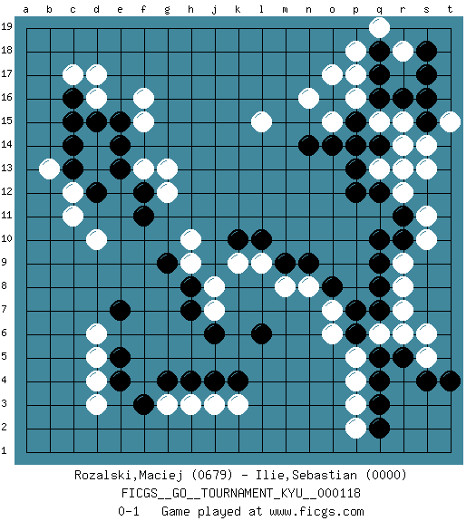 Last move : 0-1 2011 May 23 6:44:5 [Event "FICGS__GO__TOURNAMENT_KYU__000118 "] [Site "FICGS"] [Date "2011.02.23"] [Round "1"] [Black "Rozalski,Maciej "] [White "Ilie,Sebastian "] [Result "0-1"] [Rating 1 "0679"] [Rating 2 "0000"] 1.q16 d17 2.q4 d4 3.q10 o17 4.k10 d10 5.k4 r14 6.q14 q13 7.p14 r15 8.r16 p18 9.q18 q15 10.p15 p16 11.o16 p17 12.q17 n16 13.n14 o15 14.o14 r12 15.p12 s10 16.r11 s11 17.q12 r18 18.s15 s14 19.s17 q19 20.s18 t15 21.s16 s13 22.p13 r13 23.r10 r9 24.q9 r8 25.q8 r7 26.q7 r6 27.d15 d16 28.e15 f16 29.d12 q6 30.p6 p5 31.q5 o6 32.p7 p4 33.q3 p3 34.q2 p2 35.r5 s5 36.s4 s6 37.t4 o7 38.o8 c12 39.c13 c11 40.c16 c17 41.c15 b13 42.c14 f15 43.e14 g13 44.f12 g12 45.f11 f13 46.e13 l15 47.f3 h3 48.h4 j3 49.j4 g3 50.g4 k3 51.e4 d3 52.e5 d5 53.e7 d6 54.l6 h10 55.g9 h9 56.h8 j8 57.h7 j7 58.j6 k9 59.l10 m8 60.n9 n8 61.m9 l9 0-1 Here are the names of the openings (joseki) played in the four corners : Corner q16 : q16 o17Hoshi (Hwajeom, Seongjeom, Xingwei`) 4-4 Point. The star or hoshi (4-4) point, emphasizing influence at the potential expense of territory.Ikken Kakari (Hankan Keolch'im, Yi Gua`jiao~, 1-Space Low Approach). White 2 is the standard approach move to the 4-4. Corner q4 : q4 r9Hoshi (Hwajeom, Seongjeom, Xingwei`) 4-4 Point. The star or hoshi (4-4) point, emphasizing influence at the potential expense of territory. Corner d16 : d17 d15Komoku (Somok, Xiao~mu`) 3-4 Point. The komoku (3-4) point is the traditional corner enclosure move..Ikken Takagakari (Hankan Nop'dakeolch'im, Yi Gaogua`jiao~, 1-Space High Approach). The 5-4 approach move has become more popular in modern times, as modern Go emphasizes speed and influence. Corner d4 : d4 f3Hoshi (Hwajeom, Seongjeom, Xingwei`) 4-4 Point. The star or hoshi (4-4) point, emphasizing influence at the potential expense of territory.Ikken Kakari (Hankan Keolch'im, Yi Gua`jiao~, 1-Space Low Approach). Black 2 is the standard approach move to the 4-4. Player White won this Go (weiqi, baduk) game.Follow this game move after move (download ) The comb formation is alive. (Anonymous) Coffee just isn't my cup of tea. (Unknown)