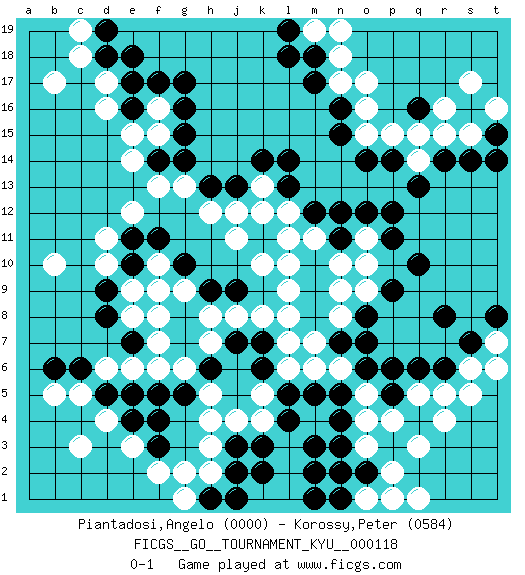 Last move : 0-1 2011 July 30 0:39:11 [Event "FICGS__GO__TOURNAMENT_KYU__000118"] [Site "FICGS"] [Date "2011.02.23"] [Round "1"] [Black "Piantadosi,Angelo"] [White "Korossy,Peter"] [Result "0-1"] [Rating 1 "0000"] [Rating 2 "0584"] 1.q16 d16 2.q4 d4 3.q10 o3 4.m3 o5 5.n4 o4 6.o7 n6 7.o6 q5 8.p5 p4 9.p6 r4 10.q6 r5 11.r6 k4 12.l5 k5 13.l4 l6 14.n5 m6 15.n3 q3 16.k2 h3 17.j2 h2 18.h1 g2 19.o2 p2 20.p1 n2 21.m2 o1 22.m5 o17 23.m17 o15 24.n16 o16 25.n15 q14 26.o14 p15 27.p14 q15 28.q13 r16 29.f17 f16 30.e17 d17 31.e16 e15 32.g16 f15 33.g17 d10 34.k3 k10 35.j13 j12 36.k12 h12 37.h13 g13 38.g14 f13 39.f14 e14 40.g15 n10 41.n12 n8 42.n7 m7 43.o8 o9 44.p9 o11 45.p12 c3 46.m8 n9 47.k6 l7 48.k7 l8 49.m9 l9 50.m10 m11 51.n11 l10 52.m12 j4 53.j3 h4 54.h6 f6 55.g8 h7 56.j7 h8 57.g7 g6 58.h9 j8 59.e10 e12 60.e11 d11 61.d9 e9 62.f9 e8 63.j9 k8 64.k11 j11 65.d18 c18 66.e18 c19 67.d19 b17 68.e7 f7 69.d8 f8 70.r14 r15 71.s14 s15 72.t15 s17 73.p11 t16 74.t14 l12 75.l13 l11 76.c6 c5 77.d5 b5 78.b6 b10 79.e4 e3 80.f4 d6 81.e5 e6 82.g5 h5 83.f5 g9 84.f3 f2 85.m1 q1 86.n1 n18 87.m18 m19 88.l19 n19 89.l18 k13 90.k14 k12 91.l14 s6 92.s7 s5 93.o2 p1 94.n2 t7 95.t8 t6 96.r8 g1 97.j1 n17 98.o12 o10 99.g10 f10 100.f11 f9 101.pass pass 0-1 Here are the names of the openings (joseki) played in the four corners : Corner q4 : q4 o3 Hoshi (Hwajeom, Seongjeom, Xingwei`) 4-4 Point. The star or hoshi (4-4) point, emphasizing influence at the potential expense of territory. Ikken Kakari (Hankan Keolch'im, Yi Gua`jiao~, 1-Space Low Approach). White 2 is the standard approach move to the 4-4. Corner q16 : q16 o17 Hoshi (Hwajeom, Seongjeom, Xingwei`) 4-4 Point. The star or hoshi (4-4) point, emphasizing influence at the potential expense of territory. Ikken Kakari (Hankan Keolch'im, Yi Gua`jiao~, 1-Space Low Approach). White 2 is the standard approach move to the 4-4. Corner d16 : d16 f17 Hoshi (Hwajeom, Seongjeom, Xingwei`) 4-4 Point. The star or hoshi (4-4) point, emphasizing influence at the potential expense of territory. Ikken Kakari (Hankan Keolch'im, Yi Gua`jiao~, 1-Space Low Approach). Black 2 is the standard approach move to the 4-4. Player White won this Go (weiqi, baduk) game. Follow this game move after move (download)Go is essentially a form of harmony. Go in the 21st century will have to be go of the 'harmony of the six points - the four quarters, the above and the below.' As in life we will need to view the whole rather than the part. Japanese go has focused too heavily on the local (joseki) rather than the whole for 300 years. The reason the Chinese and Koreans are overtaking the Japanese is that they are closer to achieve this whole-board view. (Go Seigen, 9p, 1994) Those who make the worst use of their time are the first to complain of its brevity. (Jean de la Bruyere)