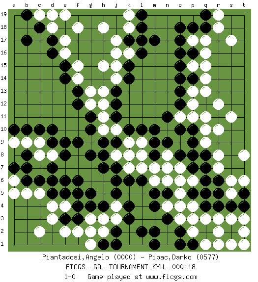Last move : 1-0 2011 September 23 12:10:51 [Event "FICGS__GO__TOURNAMENT_KYU__000118"] [Site "FICGS"] [Date "2011.02.23"] [Round "1"] [Black "Piantadosi,Angelo"] [White "Pipac,Darko"] [Result "1-0"] [Rating 1 "0000"] [Rating 2 "0577"] 1.k10 q16 2.d16 e17 3.d17 e16 4.e15 d18 5.c18 e19 6.d10 d4 7.k4 k16 8.q4 q10 9.n7 j3 10.k3 j4 11.j5 k2 12.l2 j1 13.g4 g3 14.h4 h3 15.f3 f2 16.f4 l1 17.m1 k1 18.h1 g2 19.j2 e2 20.e3 d3 21.d6 e4 22.e5 g1 23.o17 f15 24.e14 f14 25.f13 g13 26.f12 g12 27.g11 c19 28.b19 d19 29.b17 f18 30.p16 p15 31.o15 p17 32.o16 q14 33.p14 q15 34.q12 p13 35.o14 p12 36.o13 q13 37.r11 q11 38.o10 r10 39.q8 s11 40.o12 o11 41.n11 p11 42.p9 q9 43.p10 r8 44.q7 r7 45.r6 s6 46.r5 s5 47.s4 c5 48.c6 b5 49.b6 a6 50.a7 a5 51.b7 c2 52.k14 j14 53.j13 h13 54.j12 h11 55.g10 h10 56.h9 h12 57.j11 j10 58.j9 h15 59.k15 j15 60.l16 l17 61.k17 j16 62.l18 j17 63.m17 k18 64.l17 k19 65.l19 h18 66.p18 q17 67.q18 r18 68.o18 r19 69.q19 s17 70.t5 t6 71.t4 t8 72.pass o3 73.n3 n4 74.m4 p4 75.o2 p3 76.n5 o4 77.m2 p6 78.p5 o5 79.q5 o6 80.q6 n6 81.m5 m6 82.l6 m7 83.n9 n8 84.m8 o7 85.o8 l8 86.m9 l7 87.k6 k7 88.j7 j8 89.h8 l9 90.l10 q3 91.p7 r3 92.r4 p2 93.p1 q1 94.o1 r2 95.k8 k9 96.m10 s3 97.s1 r1 98.n7 t3 99.p8 r12 100.s2 t1 101.t2 t1 102.s2 s1 103.d5 h2 104.j1 h5 105.g5 h6 106.j6 g6 107.f5 g7 108.g8 f7 109.e8 f8 110.f9 e7 111.d7 d8 112.e9 c8 113.b8 c9 114.c10 b9 115.b10 a9 116.a10 j8 117.h7 k8 118.e6 n8 119.f6 n7 120.d9 t2 121.pass 1-0 Here are the names of the openings (joseki) played in the four corners : Corner d16 : d16 e17 Hoshi (Hwajeom, Seongjeom, Xingwei`) 4-4 Point. The star or hoshi (4-4) point, emphasizing influence at the potential expense of territory. Corner q16 : q16 o17 Hoshi (Hwajeom, Seongjeom, Xingwei`) 4-4 Point. The star or hoshi (4-4) point, emphasizing influence at the potential expense of territory. Ikken Kakari (Hankan Keolch'im, Yi Gua`jiao~, 1-Space Low Approach). Black 2 is the standard approach move to the 4-4. Player Black won this Go (weiqi, baduk) game. Follow this game move after move (download)When in doubt, remove the enemy stones from the board. (Bill Taylor) Hold em is to stud what chess is to checkers. (Johnny Moss)