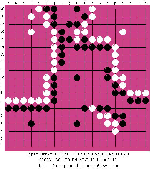 Last move : 1-0 2011 July 5 8:13:16 [Event "FICGS__GO__TOURNAMENT_KYU__000118"] [Site "FICGS"] [Date "2011.02.23"] [Round "1"] [Black "Pipac,Darko"] [White "Ludwig,Christian"] [Result "1-0"] [Rating 1 "0577"] [Rating 2 "0162"] 1.d4 q16 2.q4 d16 3.k10 k16 4.j15 g14 5.h15 g15 6.h16 g16 7.g17 f17 8.g18 f18 9.f19 e19 10.g19 d18 11.j17 k15 12.k17 l16 13.k14 l17 14.l18 m18 15.k19 m19 16.h14 g13 17.h13 g12 18.h12 g11 19.g10 f10 20.g9 f9 21.g8 f8 22.g7 f7 23.f6 e7 24.d6 d7 25.e6 c7 26.c6 b7 27.b6 a7 28.a6 q10 29.p9 p10 30.k4 r8 31.q8 q9 32.p8 p13 33.o10 p11 34.o11 p12 35.n14 m6 36.l15 m15 37.l14 n15 38.m14 o15 39.o14 p14 40.r7 s8 41.s7 t8 42.t7 o5 43.n6 n5 44.o6 p4 45.q5 p3 46.p5 o4 47.l6 1-0 This go game has been lost on time (started : 2011.02.23 15:43:26) Here are the names of the openings (joseki) played in the four corners : Corner d16 : d16 j15 Hoshi (Hwajeom, Seongjeom, Xingwei`) 4-4 Point. The star or hoshi (4-4) point, emphasizing influence at the potential expense of territory. Player Black won this Go (weiqi, baduk) game. Follow this game move after move (download)Don't reduce your own liberties. (Bill Taylor) Life is like a game of cards: the hand you are dealt represents determinism; the way you play it is free will. (Jawaharlal Nehru)