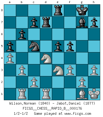 Last move : 1/2-1/2 2011 May 16 22:17:30 [Event "FICGS__CHESS__RAPID_B__000176"] [Site "FICGS"] [Date "2011.02.23"] [Round "1"] [White "Wilson,Norman"] [Black "Jabot,Daniel"] [Result "1/2-1/2"] [WhiteElo "1840"] [BlackElo "1877"] 1.d4 Nf6 2.Bf4 g6 3.e3 d6 4.Nd2 Bg7 5.Bc4 O-O 6.Ngf3 Nbd7 7.h3 Qe8 8.Bh2 e5 9.dxe5 dxe5 10.e4 Qe7 11.O-O Ne8 12.Qe2 Nd6 13.a4 a5 14.Rfd1 b6 15.Bd5 Ba6 16.Qe3 Bb7 17.Bxb7 Nxb7 18.Nc4 f6 19.Nfd2 Ndc5 20.Nb1 Ne6 21.Nc3 Qc5 22.b3 Qxe3 23.Nxe3 Nbc5 24.f3 Rf7 25.Kh1 Re8 26.Bg1 Nd4 27.Nb5 f5 28.exf5 gxf5 29.Rab1 Rd7 30.Nxd4 1/2-1/2 Queen's pawn game Kingside Castling by player Black (move 5) Kingside Castling by player White (move 11) This chess game ended in a draw. Follow this game move after move (download)If your opponent cannot do anything active, then don't rush the position; instead you should let him sit there, suffer, and beg you for a draw. (Jeremy Silman) Ich war zu klein für die Schach-Schülermannschaft! (Woody Allen) Sin errores no puede haber brillantez. (Emanuel Lasker) Karpov est une pièce de musée. (Garry Kasparov) It's unlucky to be superstitious. (Dave Enteles)