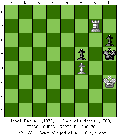 Last move : 1/2-1/2 2011 September 15 22:26:39 [Event "FICGS__CHESS__RAPID_B__000176"] [Site "FICGS"] [Date "2011.02.23"] [Round "1"] [White "Jabot,Daniel"] [Black "Andrucis,Maris"] [Result "1/2-1/2"] [WhiteElo "1877"] [BlackElo "1868"] 1.e4 e5 2.Nf3 Nf6 3.Nxe5 d6 4.Nf3 Nxe4 5.d4 d5 6.Bd3 Be7 7.O-O O-O 8.c4 Nf6 9.h3 Nc6 10.Nc3 Be6 11.c5 b6 12.Be3 bxc5 13.dxc5 a6 14.a3 Nd7 15.Bb1 Nde5 16.Nxe5 Nxe5 17.f4 Nc4 18.Bd4 f5 19.Re1 Qd7 20.Ba2 Rae8 21.Qf3 c6 22.Bxc4 dxc4 23.Rad1 Bd8 24.Bf6 Qc8 25.Bxd8 Rxd8 26.Rd6 Rxd6 27.cxd6 Qd7 28.Rd1 Rb8 29.Qe2 Kf7 30.Qe5 Qa7+ 31.Kh2 h6 32.Rd2 a5 33.Rd1 Rxb2 34.Re1 Qd7 35.Na4 Rd2 36.Nc5 Qxd6 37.Qxe6+ Qxe6 38.Rxe6 Rd3 39.a4 c3 40.Rxc6 Rd4 41.Nb3 Rxf4 42.Nxa5 Rxa4 43.Nc4 Ke7 44.Nb6 Rd4 45.Rxc3 Kd6 46.Rc4 Rd3 47.Rc8 Rb3 48.Nc4+ Kd5 49.Nd2 Rb6 50.h4 Ke6 51.h5 Rb2 52.Nf3 Rb4 53.Rc6+ Ke7 54.Kh3 Rg4 55.g3 Ra4 56.Nh4 Ra5 57.Ng6+ Kf7 58.Nh8+ Ke7 59.Rc7+ Kf6 60.Rf7+ Kg5 61.Rxg7+ Kxh5 62.Ng6 Ra4 63.Nf4+ Rxf4 64.gxf4 1/2-1/2 Petrov : Classical attack, Mason variation Kingside Castling by player White (move 7) Kingside Castling by player Black (move 7) 10 pieces endgame at move 45 : White KRNPP , Black KRPPP WHITE : King + 1 Rook 1 Knight 2 Pawns BLACK : King + 1 Rook 3 Pawns 9 pieces endgame at move 61 : White KRNPP , Black KRPP WHITE : King + 1 Rook 1 Knight 2 Pawns BLACK : King + 1 Rook 2 Pawns 8 pieces endgame at move 61 : White KRNP , Black KRPP WHITE : King + 1 Rook 1 Knight 1 Pawn BLACK : King + 1 Rook 2 Pawns 7 pieces endgame at move 63 : White KRP , Black KRPP WHITE : King + 1 Rook 1 Pawn BLACK : King + 1 Rook 2 Pawns 6 pieces endgame at move 64 : White KRP , Black KPP WHITE : King + 1 Rook 1 Pawn BLACK : King + 2 Pawns This chess game ended in a draw. Follow this game move after move (download)When in doubt... play Chess ! (Tevis) Schach wird sich dank seiner hohen kulturellen Tradition immer durchsetzen. In näherer Zukunft womöglich sogar als Gegenreaktion auf die maßlose Reizüberflutung im Freizeit- und Spielbereich. (Garry Kasparov) Tu puedes aprender mucho mas de una partida que pierdas que de una partida ganada. Tendras que perder cientos de partidas antes de llegar a ser un buen jugador. (Jose Raul Capablanca) Vouloir jouer aux échecs contre soi-même est aussi paradoxal que vouloir marcher sur son ombre. (Stefan Zweig) Just because you do not take an interest in politics doesn't mean politics won't take an interest in you. (Pericles 430 B.C.)