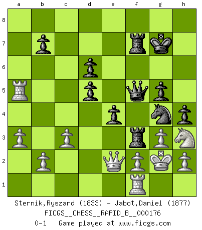 Last move : 0-1 2011 April 10 21:20:55 [Event "FICGS__CHESS__RAPID_B__000176"] [Site "FICGS"] [Date "2011.02.23"] [Round "1"] [White "Sternik,Ryszard"] [Black "Jabot,Daniel"] [Result "0-1"] [WhiteElo "1833"] [BlackElo "1877"] 1.a3 d5 2.e3 e5 3.d4 exd4 4.exd4 Nf6 5.Bd3 Bd6 6.Qe2+ Be6 7.Bf5 Qe7 8.Bxe6 fxe6 9.Nf3 O-O 10.O-O Nc6 11.Re1 Rae8 12.Nc3 e5 13.Nb5 e4 14.Ng5 h6 15.Nh3 Nxd4 16.Nxd4 Qe5 17.Bf4 Qxd4 18.Bxd6 cxd6 19.c3 Qc5 20.Rad1 g5 21.Rd4 Rf7 22.Red1 Qc8 23.Kh1 Qf5 24.Rf1 Kg7 25.Qd1 Re5 26.Rb4 Ng4 27.Qe2 h5 28.Ra4 Qf6 29.Rxa7 Rf5 30.g3 Rf3 31.Kg2 h4 32.Ra5 Qf5 0-1 Anderssen's Opening Kingside Castling by player Black (move 9) Kingside Castling by player White (move 10) Player Black won this chess game. Follow this game move after move (download)Chess teaches you to control the initial excitement you feel when you see something that looks good and it trains you to think objectively when you're in trouble. (Stanley Kubrick) Ja, ich habe einmal eine Blitzpartie gespielt, es war in einem Zug, 1929. --im Interview 1989 (Mikhail Moiseyevich Botvinik) El Ajedrez moderno está demasiado preocupado con cosas como la estructura de Peones. Olvidenlo, el Jaque Mate termina la partida. (Nigel Short) On entre au jeu d'Echecs comme on entre en Religion. Pour le joueur d'Echecs, la partie d'Echecs c'est l'office, la messe, le défilé du 1er Mai, le dépôt de gerbe au Monument aux Morts. C'est un drame sacré. (Michel Roos) Internal peace cannot coexist with external war. (Don Groves)