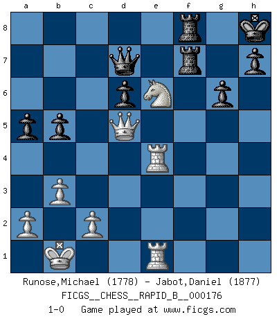 Last move : 1-0 2011 March 31 20:28:7 [Event "FICGS__CHESS__RAPID_B__000176"] [Site "FICGS"] [Date "2011.02.23"] [Round "1"] [White "Runose,Michael"] [Black "Jabot,Daniel"] [Result "1-0"] [WhiteElo "1778"] [BlackElo "1877"] 1.e4 c5 2.Nf3 d6 3.d4 cxd4 4.Nxd4 Nf6 5.Nc3 g6 6.Be3 Bg7 7.f3 O-O 8.Qd2 Nc6 9.O-O-O Bd7 10.Kb1 Rc8 11.g4 Ne5 12.Be2 Nc4 13.Bxc4 Rxc4 14.h4 b5 15.h5 a5 16.hxg6 fxg6 17.e5 Nxg4 18.fxg4 Bxg4 19.Rdg1 Qd7 20.exd6 exd6 21.b3 R4c8 22.Bh6 Bxh6 23.Qxh6 Rxc3 24.Rxg4 Rf6 25.Re4 Rc8 26.Rhe1 Rf7 27.Qg5 Rcf8 28.Qd5 Kh8 29.Ne6 1-0 Sicilian : Dragon, Yugoslav attack, 7...O-O Kingside Castling by player Black (move 7) Queenside Castling by player White (move 9) Player White won this chess game. Follow this game move after move (download)It is difficult to play against Einstein's theory --on his first loss to Fischer. (Mikhail Tal) Es ist nicht das erste mal, dass sich die FIDE dem Arabischen Geld gebeugt hat (über die FIDE WM 2004 in Lybien). (Larry Evans) El Ajedrez es un terrible juego. Si no controlas el centro, tu oponente tiene una posición mas holgada. Si tienes control del centro, ¡entonces realmente tu tienes algo de que preocuparte!. (Siegbert Tarrasch) Les Echecs ne sont pas pour les âmes timides. Ils requièrent un homme entier, qui ne s'arrête pas aveuglément à ce qui a été déjà établi, mais qui tente individuellement de sonder les profondeurs du jeu. (W. Steinitz) If you ain't just a little scared when you enter a casino, you are either very rich or you haven't studied the games enough. (Pappy)