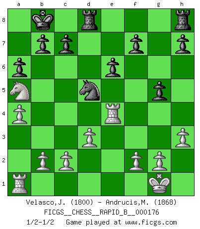 Last move : 1/2-1/2 2011 March 1 20:17:14 [Event "FICGS__CHESS__RAPID_B__000176"] [Site "FICGS"] [Date "2011.02.23"] [Round "1"] [White "Velasco,Jose Maria"] [Black "Andrucis,Maris"] [Result "1/2-1/2"] [WhiteElo "1800"] [BlackElo "1868"] 1.e4 d5 2.exd5 Qxd5 3.Nf3 Bg4 4.Be2 Nc6 5.Nc3 Qd7 6.O-O Nf6 7.Re1 O-O-O 8.h3 Bxf3 9.Bxf3 Kb8 10.a4 Nd4 11.Nb5 Nxf3+ 12.Qxf3 a6 13.Nc3 e6 14.d3 Bc5 15.Bf4 Bd4 16.Ne2 Nd5 17.Nxd4 Nxf4 18.Nb3 g5 19.Na5 Qd5 20.Qxd5 Nxd5 21.Re4 1/2-1/2 Scandinavian (centre counter) defense Kingside Castling by player White (move 6) Queenside Castling by player Black (move 7) This chess game ended in a draw. Follow this game move after move (download)Robert Fischer is a law unto himself. (Larry Evans) Immer nach dem besten Zug zu suchen ist ziemlich unpraktisch. (Nigel Short) Si yo gano un torneo, yo lo gano por mí mismo. Yo hago las jugadas. Nadie me ayuda. (Bobby Fischer) La victoire dans une partie d'Echecs appartient la plupart du temps à celui qui voit un peu plus loin que l'adversaire. (Lasker) Crush them ! Make them suffer ! (General Grievous in Star Wars ep.3)