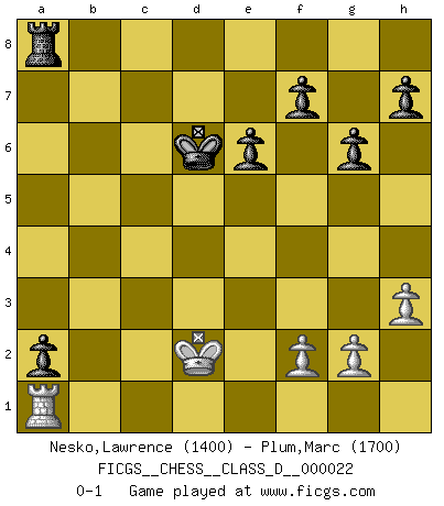 Last move : 0-1 2007 March 25 21:16:18 [Event "FICGS__CHESS__CLASS_D__000022"] [Site "FICGS"] [Date "2006.12.11"] [Round "1"] [White "Nesko,Lawrence"] [Black "Plum,Marc"] [Result "0-1"] [WhiteElo "1400"] [BlackElo "1700"] 1.c4 Nf6 2.d4 g6 3.Nc3 d5 4.cxd5 Nxd5 5.e4 Nxc3 6.bxc3 Bg7 7.Nf3 c5 8.Bb5+ Nc6 9.O-O cxd4 10.cxd4 O-O 11.Bxc6 bxc6 12.Rb1 Bg4 13.Bb2 Qa5 14.e5 Qxa2 15.Bc3 Qd5 16.Qe2 Rfb8 17.Bb4 e6 18.Bd6 Rxb1 19.Rxb1 Bf8 20.Bxf8 Rxf8 21.Qe3 Bxf3 22.Qxf3 Qxd4 23.Qxc6 Rd8 24.h3 Qxe5 25.Qc1 a5 26.Rb7 Ra8 27.Qc7 Qxc7 28.Rxc7 a4 29.Rc1 a3 30.Ra1 a2 31.Kf1 Kf8 32.Ke2 Ke7 33.Kd2 Kd6 0-1 English, 1...Nf6 (Anglo-Indian defense) Kingside Castling by player White (move 9) Kingside Castling by player Black (move 10) Player Black won this chess game. Follow this game move after move (download)Help your pieces so they can help you. (Paul Morphy) Wenn du auf das Glück wartest, wird das Leben ziemlich langweilig. (Mikhail Nekhemyevich Tal) Los finales de Peón son del Ajedrez lo que el cesped es del Golf. (Cecil Purdy) Demandez au pauvre Cg1 ce qu'il en pense. Eduard Gufeld à propos de la variante Saemisch de l'Est-Indienne. Your best chance to get a Royal Flush in a casino is in the bathroom. (Anonymous)