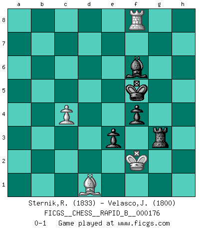 Last move : 0-1 2011 March 30 16:31:4 [Event "FICGS__CHESS__RAPID_B__000176"] [Site "FICGS"] [Date "2011.02.23"] [Round "1"] [White "Sternik,Ryszard"] [Black "Velasco,Jose Maria"] [Result "0-1"] [WhiteElo "1833"] [BlackElo "1800"] 1.Nf3 Nf6 2.b4 d5 3.Bb2 Bf5 4.a3 a5 5.b5 e6 6.e3 Bd6 7.Be2 Nbd7 8.Nh4 Bg6 9.Nxg6 hxg6 10.d3 c6 11.bxc6 bxc6 12.Nd2 Rb8 13.Rb1 Qe7 14.a4 Nb6 15.Bc3 Qa7 16.Ra1 c5 17.Nb3 O-O 18.O-O Qc7 19.h3 c4 20.Nxa5 cxd3 21.Qxd3 Ne4 22.Bd4 Rfc8 23.Nb3 Nc4 24.Ra2 Ne5 25.Bxe5 Bxe5 26.Bf3 Nc3 27.R2a1 Rb4 28.a5 Ra8 29.g3 Rc4 30.Nd2 Rc6 31.Nb3 g5 32.Bg2 Ra7 33.Rae1 Na2 34.e4 d4 35.f4 gxf4 36.gxf4 Rc3 37.Qb5 Bxf4 38.Nxd4 Ra8 39.e5 Rb8 40.Qa4 Rc4 41.Qxa2 Rxd4 42.a6 Qa7 43.Kh1 Rb6 44.c3 Rxa6 45.Qb1 Rb6 46.Qc2 Ra4 47.Re4 Rxe4 48.Qxe4 Bh6 49.Qd4 Qc7 50.Ra1 g6 51.Ra8+ Kg7 52.Bf3 Rb1+ 53.Kg2 Rb2+ 54.Kh1 Qe7 55.Qd6 Rb1+ 56.Kg2 Qg5+ 57.Bg4 Kh7 58.Qd8 Qxd8 59.Rxd8 Bf4 60.Rd7 Kg8 61.c4 Kf8 62.Be2 Bxe5 63.h4 Ke8 64.Rd2 Ke7 65.h5 gxh5 66.Bxh5 f5 67.Be2 Bd6 68.Ra2 Bc5 69.Ra5 Bd4 70.Rb5 Rg1+ 71.Kf3 e5 72.Rd5 Ke6 73.Rd8 e4+ 74.Kf4 Be5+ 75.Ke3 Rg3+ 76.Kf2 f4 77.Re8+ Kf5 78.Rf8+ Bf6 79.Bd1 e3+ 0-1 Reti Opening Kingside Castling by player Black (move 17) Kingside Castling by player White (move 18) 10 pieces endgame at move 65 : White KRBP , Black KRBPPP WHITE : King + 1 Rook 1 Bishop 1 Pawn BLACK : King + 1 Rook 1 Bishop 3 Pawns 9 pieces endgame at move 66 : White KRBP , Black KRBPP WHITE : King + 1 Rook 1 Bishop 1 Pawn BLACK : King + 1 Rook 1 Bishop 2 Pawns Player Black won this chess game. Follow this game move after move (download)Chess is a terrible game. If you have no center, your opponent has a freer position. If you do have a center, then you really have something to worry about ! (Siegbert Tarrasch) Rubinstein ist ein Turmendspiel, welches die Götter vor tausenden von Jahren begannen. (Savielly Grigorievitsch Tartakower) Cuando veas una buena jugada, trata de encontrar otra mejor. (Emanuel Lasker) Vous n'êtes pas toujours obligé de jouer le meilleur coup. Un coup doit être actif, entreprenant, correct et beau ! (David Bronstein) If you know the enemy and know yourself you need not fear the results of a hundred battles. (Sun Tzu)
