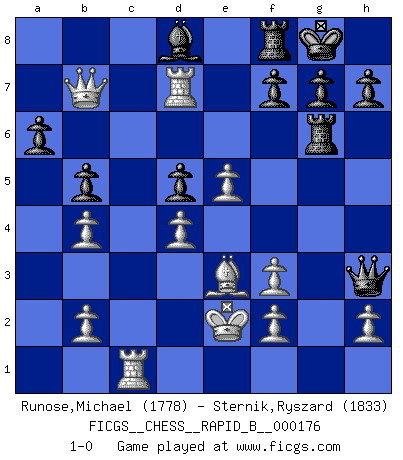 Last move : 1-0 2011 March 8 20:49:6 [Event "FICGS__CHESS__RAPID_B__000176"] [Site "FICGS"] [Date "2011.02.23"] [Round "1"] [White "Runose,Michael"] [Black "Sternik,Ryszard"] [Result "1-0"] [WhiteElo "1778"] [BlackElo "1833"] 1.e4 e5 2.Nf3 Nc6 3.Bb5 a6 4.Ba4 Nf6 5.O-O Be7 6.Re1 b5 7.Bb3 d6 8.c3 O-O 9.d4 Bg4 10.Be3 exd4 11.cxd4 Na5 12.Nbd2 Nxb3 13.axb3 d5 14.e5 Ne4 15.Qc2 Nxd2 16.Bxd2 Bxf3 17.gxf3 Qd7 18.b4 Rfb8 19.Rec1 Rb6 20.Qxc7 Rg6+ 21.Kf1 Qe6 22.Qb7 Rd8 23.Rc7 Bh4 24.Be3 Rf8 25.Rac1 Qh3+ 26.Ke2 Bd8 27.Rd7 1-0 Ruy Lopez : Closed Kingside Castling by player White (move 5) Kingside Castling by player Black (move 8) Player White won this chess game. Follow this game move after move (download)We must make sure that Chess will not be like a dead language, very interesting, but for a very small group. (Sytze Faber) Vielleicht wirkt die Aura früherer Spieler glanzvoller als die der heutigen Spieler, aber das liegt daran, dass man kein Programm wie Fritz hatte, das einem all die Löcher in ihren Partien zeigt. (Vladimir Kramnik) El Ajedrez es despiadado: debes de estar preparado para matar gente. (Nigel Short) On peut tirer plus d'utilité d'une partie perdue que de 100 parties gagnées. (Capablanca) A computer lets you make more mistakes faster than any invention in human history - with the possible exceptions of handguns and tequila. (Mitch Ratcliffe)