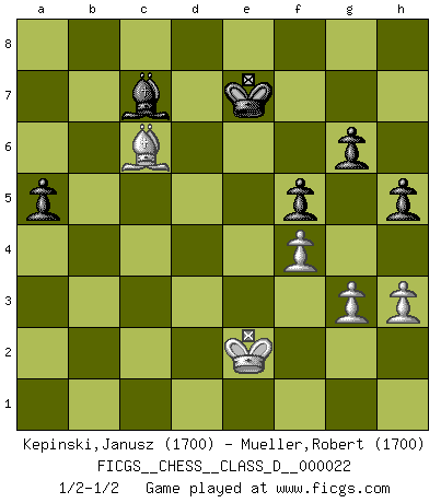 Last move : 1/2-1/2 2007 February 25 17:29:53 [Event "FICGS__CHESS__CLASS_D__000022"] [Site "FICGS"] [Date "2006.12.11"] [Round "1"] [White "Kepinski,Janusz"] [Black "Mueller,Robert"] [Result "1/2-1/2"] [WhiteElo "1700"] [BlackElo "1700"] 1.c4 e5 2.Nc3 Nf6 3.g3 g6 4.Bg2 Bg7 5.e4 O-O 6.Nge2 d6 7.O-O Re8 8.d4 exd4 9.Nxd4 Nc6 10.Nxc6 bxc6 11.Bf4 Ng4 12.c5 Rb8 13.Qd2 Ne5 14.cxd6 cxd6 15.Rab1 Nc4 16.Qd3 Rb4 17.a3 Nxb2 18.Qxd6 Qxd6 19.Bxd6 Rd4 20.e5 Rxd6 21.exd6 Bxc3 22.Bxc6 Rd8 23.d7 Bxd7 24.Rbd1 Nxd1 25.Rxd1 Bb2 26.Rxd7 Rxd7 27.Bxd7 Bxa3 28.f4 f5 29.Kf2 Kf8 30.Ke2 Ke7 31.Bb5 a5 32.h3 Bd6 33.Bc6 Bc7 34.Ba4 h6 35.Bc6 h5 1/2-1/2 English : Bremen system with ...g6 Kingside Castling by player Black (move 5) Kingside Castling by player White (move 7) This chess game ended in a draw. Follow this game move after move (download)Play the opening like a book, the middle game like a magician, and the endgame like a machine. (Spielmann) Karpov ist ein Museumsstück. (Garry Kasparov) Solo el jugador con la iniciativa tiene el derecho a atacar. (Wilhelm Steinitz) Nous vivons dans un monde échiquéen : chaque jour qui passe est un défi à relever. (Philosophe Sasha) He is a liar. I just don't know what the lie is yet. (Horatio Caine, C.S.I. Miami)