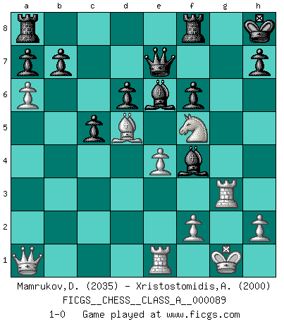 Last move : 1-0 2011 August 3 9:5:22 [Event "FICGS__CHESS__CLASS_A__000089"] [Site "FICGS"] [Date "2011.03.17"] [Round "1"] [White "Mamrukov,Dmitri"] [Black "Xristostomidis,Alkis"] [Result "1-0"] [WhiteElo "2035"] [BlackElo "2000"] 1.d4 Nf6 2.c4 e6 3.g3 c5 4.d5 exd5 5.cxd5 d6 6.Nc3 g6 7.Bg2 Bg7 8.Nf3 O-O 9.O-O Nbd7 10.a4 Qe7 11.Re1 Ne4 12.Nxe4 Qxe4 13.Bf4 Qe7 14.Ra3 Nb6 15.Nd2 g5 16.a5 Nxd5 17.Bxd5 gxf4 18.gxf4 Kh8 19.Rg3 Bxb2 20.Nf3 Be6 21.e4 Bg7 22.a6 Bh6 23.Qa1+ f6 24.Nh4 Bxf4 25.Nf5 1-0 This chess game has been lost on time (started : 2011.03.17 11:32:43) Catalan Opening Kingside Castling by player Black (move 8) Kingside Castling by player White (move 9) Player White won this chess game. Follow this game move after move (download)Any material change in a position must come about by mate, a capture, or a Pawn promotion. (Purdy) Alle offensichtlichen Züge sehen nach dem Spiel in der Analyse verdächtig aus. (Viktor Kortschnoi) Mis oponentes también hacen buenas movidas. A veces yo no tomo esas cosas en consideración. (Bobby Fischer) Il vaut toujours mieux jouer un plan faux de façon logique que de n'avoir pas de plan du tout. (Victor Kortchnoï) The mind is like a parachute, it only functions when its open. (Unknown)