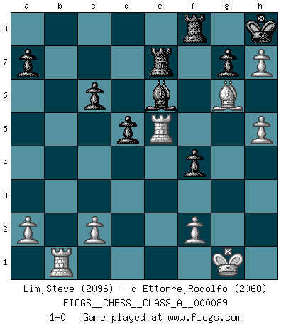 Last move : 1-0 2011 May 26 16:5:45 [Event "FICGS__CHESS__CLASS_A__000089"] [Site "FICGS"] [Date "2011.02.24"] [Round "1"] [White "Lim,Steve"] [Black "d Ettorre,Rodolfo"] [Result "1-0"] [WhiteElo "2096"] [BlackElo "2060"] 1.e4 e5 2.Nf3 Nc6 3.Bb5 Nf6 4.O-O Nxe4 5.Re1 Nd6 6.Nxe5 Be7 7.Bf1 O-O 8.d4 Nf5 9.d5 Nxe5 10.Rxe5 d6 11.Re1 Bf6 12.Nd2 Bg5 13.Bd3 c6 14.dxc6 bxc6 15.Nc4 Bf6 16.Bf4 d5 17.Ne5 Qb6 18.Ng4 Qxb2 19.Rb1 Qd4 20.Nxf6+ Qxf6 21.Qd2 Be6 22.Bg5 Qg6 23.Qf4 Rae8 24.g4 f6 25.gxf5 fxg5 26.fxg6 gxf4 27.gxh7+ Kh8 28.Bg6 Re7 29.h4 Rd8 30.Re5 Rf8 31.h5 1-0 Ruy Lopez : Berlin defense, Open variation Kingside Castling by player White (move 4) Kingside Castling by player Black (move 7) Player White won this chess game. Follow this game move after move (download)My opponents make good moves too. Sometimes I don't take these things into consideration. (Bobby Fischer) Der Bart als Geschlechtszeichen mitten im Gesicht ist obszön. Daher gefällt er den Weibern. [Zugegeben, kein Schachzitat, aber unglaublich originell] (Arthur Schopenhauer) Cuando le juegas a Fischer, no es una cuestion de si vas a ganar o perder. Es una cuestion de si vas a sobrevivir. (Boris Spassky) Avec des compensations pour le matériel en plus... (Anonyme) To be champion requires more than simply being a strong player; one has to be a strong human being as well. (Anatoly Karpov)