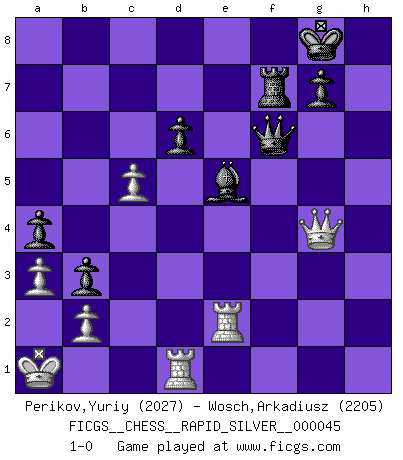 Last move : 1-0 2011 June 30 22:12:7 [Event "FICGS__CHESS__RAPID_SILVER__000045"] [Site "FICGS"] [Date "2011.02.25"] [Round "2"] [White "Perikov,Yuriy"] [Black "Wosch,Arkadiusz"] [Result "1-0"] [WhiteElo "2027"] [BlackElo "2205"] 1.e4 c5 2.Nf3 Nc6 3.d4 cxd4 4.Nxd4 Nf6 5.Nc3 d6 6.Bg5 e6 7.Qd2 a6 8.O-O-O Bd7 9.f3 Be7 10.h4 h6 11.Be3 h5 12.Nxc6 Bxc6 13.Kb1 b5 14.Bd3 Qc7 15.Bg5 b4 16.Ne2 a5 17.Rc1 O-O 18.Nd4 Bd7 19.c4 Rfc8 20.g4 hxg4 21.fxg4 a4 22.Qg2 Bc6 23.Nxc6 Qxc6 24.Rcf1 Ra5 25.Qf3 Rf8 26.Rh2 Rc5 27.Be3 Nd7 28.Bxc5 Qxc5 29.e5 Nxe5 30.Qe4 Nxd3 31.Qxd3 Rc8 32.Qf3 Rf8 33.Qe4 Bf6 34.g5 Be5 35.Rhf2 b3 36.a3 Qd4 37.Qe2 Qxh4 38.g6 Bf6 39.Ka1 Qg5 40.Rg2 Qe5 41.Qg4 fxg6 42.Re2 Qc5 43.Qxe6+ Rf7 44.Kb1 Qd4 45.Rh1 Be5 46.Qe8+ Rf8 47.Qxg6 Rf6 48.Qe8+ Rf8 49.Qe6+ Rf7 50.Ka1 Qa7 51.Rd1 Qe7 52.Qg4 Qf6 53.c5 1-0 Sicilian defense Queenside Castling by player White (move 8) Kingside Castling by player Black (move 17) Player White won this chess game. Follow this game move after move (download)Personally, I rather look forward to a computer program winning the world Chess Championship. Humanity needs a lesson in humility. (Richard Dawkings) Ich würde mich als ganz normalen Jungen bezeichnen [Im Alter von 12]. (Sergej Karjakin) Para mi, el Ajedrez es la vida y cada partida es como una nueva vida. Todo jugador de Ajedrez suele vivir muchas vidas durante su vida. (Eduard Gufeld) Même un GMI sait rarement calculer sur plus de cinq coups une attaque à sacrifices. (Rudolf Spielmann) Now be brave and don't look back. Don't look back. (Shmi Skywalker in Star Wars ep.1)