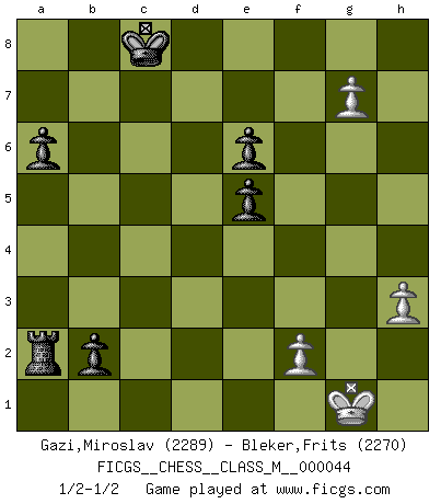 Last move : 1/2-1/2 2011 October 26 20:31:27 [Event "FICGS__CHESS__CLASS_M__000044"] [Site "FICGS"] [Date "2011.02.26"] [Round "1"] [White "Gazi,Miroslav"] [Black "Bleker,Frits"] [Result "1/2-1/2"] [WhiteElo "2289"] [BlackElo "2270"] 1.d4 d5 2.c4 c6 3.Nf3 Nf6 4.e3 e6 5.Nc3 Nbd7 6.Qc2 Bd6 7.Be2 O-O 8.O-O dxc4 9.Bxc4 a6 10.Bd3 c5 11.Rd1 Qc7 12.h3 cxd4 13.exd4 b5 14.d5 Ne5 15.Nxe5 Bxe5 16.Bg5 b4 17.Bxf6 gxf6 18.Na4 Qxc2 19.Bxc2 exd5 20.Nb6 Rb8 21.Nxd5 Be6 22.Bb3 Bxb2 23.Rab1 Be5 24.Ne7+ Kg7 25.Nc6 Rb6 26.Nxe5 fxe5 27.Bxe6 fxe6 28.Rb3 Rf7 29.Rg3+ Kf8 30.Rd8+ Ke7 31.Rc8 Kd7 32.R3g8 Kd6 33.Rgd8+ Rd7 34.Rxd7+ Kxd7 35.Rh8 Rd6 36.Rxh7+ Kc6 37.g4 Rd2 38.Rh8 Kc7 39.g5 Rxa2 40.g6 b3 41.g7 b2 42.Rc8+ Kxc8 1/2-1/2 QGD Slav : 4.e3 Kingside Castling by player Black (move 7) Kingside Castling by player White (move 8) 10 pieces endgame at move 42 : White KPPP , Black KRPPPP WHITE : King + 3 Pawns BLACK : King + 1 Rook 4 Pawns This chess game ended in a draw. Follow this game move after move (download)My style is somewhere between that of Tal and Petrosian. (Reshevsky) Es ist besser die Steine des Gegners zu opfern. (Savielly Grigorievitsch Tartakower) Aún el Rey más flojo huye despavorido ante la amenaza de un Jaque doble. (Aaron Nimzowitsch) Mon pion favori sur ma case favorite ! Bronstein en parlant d'un coup de pion en h5 quand il avait les Noirs. There will be no order, only chaos. (Sol Robeson in Pi by Darren Aronofsky)