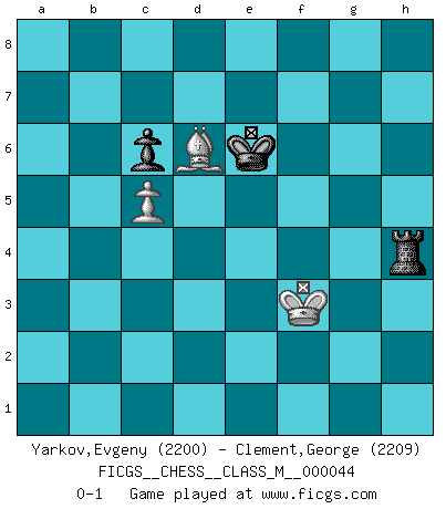 Last move : 0-1 2012 January 4 5:33:36 [Event "FICGS__CHESS__CLASS_M__000044"] [Site "FICGS"] [Date "2011.02.26"] [Round "1"] [White "Yarkov,Evgeny"] [Black "Clement,George"] [Result "0-1"] [WhiteElo "2200"] [BlackElo "2209"] 1.e4 c6 2.d4 d5 3.e5 c5 4.dxc5 e6 5.Be3 Ne7 6.c3 Nd7 7.Bb5 a6 8.Ba4 Nc6 9.b4 Ndxe5 10.Nf3 Nxf3+ 11.Qxf3 Be7 12.O-O O-O 13.Nd2 Bf6 14.Bf4 e5 15.Bg3 e4 16.Qe3 a5 17.Rfd1 axb4 18.Bxc6 bxc6 19.Nxe4 Bxc3 20.Nxc3 Ra3 21.Qd4 bxc3 22.Rdc1 Re8 23.f3 Re2 24.Rxc3 R3xa2 25.Rxa2 Rxa2 26.Rb3 Qg5 27.Qe3 Qxe3+ 28.Rxe3 Be6 29.h3 h5 30.Rb3 f6 31.Rb8+ Kf7 32.Rb7+ Ke8 33.Rxg7 d4 34.Rb7 d3 35.Bf4 Bc4 36.Rb1 Kf7 37.Rd1 Ke6 38.Rd2 Ra1+ 39.Kf2 Kd5 40.Be3 Ba6 41.h4 f5 42.g3 Kc4 43.Kg2 Kc3 44.Kf2 Bc4 45.Bf4 Bb3 46.Be3 Bd1 47.Bh6 Be2 48.Ke3 Rg1 49.Bf4 Rf1 50.Rxe2 dxe2 51.Kxe2 Rb1 52.Ke3 Re1+ 53.Kf2 Rd1 54.g4 fxg4 55.fxg4 Rh1 56.Bg5 hxg4 57.Kg3 Kd4 58.Kxg4 Ke4 59.Kg3 Rg1+ 60.Kf2 Rg4 61.Bd8 Ke5 62.Kf3 Rc4 63.Be7 Ke6 64.Bd6 Rxh4 0-1 This chess game has been lost on time (started : 2011.02.26 0:29:46) Caro-Kann : Advance variation Kingside Castling by player White (move 12) Kingside Castling by player Black (move 12) 10 pieces endgame at move 54 : White KBPPP , Black KRPPP WHITE : King + 1 Bishop 3 Pawns BLACK : King + 1 Rook 3 Pawns 9 pieces endgame at move 55 : White KBPPP , Black KRPP WHITE : King + 1 Bishop 3 Pawns BLACK : King + 1 Rook 2 Pawns 8 pieces endgame at move 56 : White KBPP , Black KRPP WHITE : King + 1 Bishop 2 Pawns BLACK : King + 1 Rook 2 Pawns 7 pieces endgame at move 58 : White KBPP , Black KRP WHITE : King + 1 Bishop 2 Pawns BLACK : King + 1 Rook 1 Pawn 6 pieces endgame at move 64 : White KBP , Black KRP WHITE : King + 1 Bishop 1 Pawn BLACK : King + 1 Rook 1 Pawn Player Black won this chess game. Follow this game move after move (download)Not only will I predict his triumph over Botvinnik, but I'll go further and say that he'll probably be the greatest Chess player that ever lived. (John Collins) Jeder leidlich begabte Spieler, er braucht keineswegs hervorragend veranlagt zu sein, kann es zum Meister bringen. Aber das ist ja auch gar nicht nötig! Der richtige Standpunkt ist es, zu seinem Vergnügen zu spielen, und man glaube ja nicht, dass der Genuss proportional dem Können sei. (Siegbert Tarrasch) Los Peones son nacidos libres, y aún así, se encuentran encadenados por todos lados. (Rick Kennedy) Il s'avisa de me proposer d'apprendre les échecs qu'il jouait un peu... me voilà forcené des échecs. J'achète un échiquier, je m'enferme dans ma chambre, j'y passe des jours et des nuits à vouloir apprendre par cur toutes les parties. (Jean-Jacques Rousseau, Confessions) Now you put water in a cup, it becomes the cup; You put water into a bottle it becomes the bottle; You put it in a teapot it becomes the teapot. Water can flow or it can crash. Be water, my friend. (Bruce Lee)