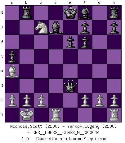 Last move : 1-0 2011 May 21 6:29:19 [Event "FICGS__CHESS__CLASS_M__000044"] [Site "FICGS"] [Date "2011.02.26"] [Round "1"] [White "Nichols,Scott"] [Black "Yarkov,Evgeny"] [Result "1-0"] [WhiteElo "2200"] [BlackElo "2200"] 1.e4 c5 2.Nf3 Nc6 3.Nc3 d6 4.d4 cxd4 5.Nxd4 Nf6 6.Bg5 e6 7.Qd2 a6 8.Nxc6 bxc6 9.O-O-O Be7 10.Bxf6 gxf6 11.Kb1 Rb8 12.Bc4 d5 13.Bb3 a5 14.exd5 cxd5 15.Qh6 Bf8 16.Qe3 Qb6 17.Nxd5 Qxe3 18.Ba4+ Bd7 19.Nc7+ 1-0 This chess game has been lost on time (started : 2011.02.26 0:29:46) Sicilian defense Queenside Castling by player White (move 9) Player White won this chess game. Follow this game move after move (download)Help your pieces so they can help you. (Paul Morphy) Je mehr ich von der FIDE weiss, um so weniger verstehe ich. (Alexander Kalifman) Cuando tengas duda... ¡juega al Ajedrez!. (Tevis) Aux échecs, les retours au sommet sont rares : les dommages psychologiques consécutifs à une défaite sont trop sévères. (Daily Telegraph) See no evil, hear no evil, speak no evil. (The 3 monkeys)