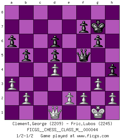 Last move : 1/2-1/2 2011 June 6 17:0:5 [Event "FICGS__CHESS__CLASS_M__000044"] [Site "FICGS"] [Date "2011.02.26"] [Round "1"] [White "Clement,George"] [Black "Fric,Lubos"] [Result "1/2-1/2"] [WhiteElo "2209"] [BlackElo "2245"] 1.Nf3 Nf6 2.c4 e6 3.d4 d5 4.g3 Be7 5.Bg2 O-O 6.O-O dxc4 7.Qc2 a6 8.Qxc4 b5 9.Qc2 Bb7 10.Bd2 Be4 11.Qc1 Bb7 12.Bf4 Nd5 13.Nc3 Nxf4 14.Qxf4 Nd7 15.Ne4 Bd5 16.Rfd1 Rc8 17.Ne5 Bd6 18.Nxd6 cxd6 19.Nxd7 Qxd7 20.Bxd5 exd5 21.Rdc1 g6 22.Qd2 h5 23.Rxc8 Rxc8 24.Rc1 Rxc1+ 25.Qxc1 Qg4 26.Qd2 Qf5 27.a3 Kg7 28.Qd1 h4 1/2-1/2 Reti Opening Kingside Castling by player Black (move 5) Kingside Castling by player White (move 6) This chess game ended in a draw. Follow this game move after move (download)A big shock; the best chess player in history has passed away. (Lajos Portisch, about Bobby Fischer's death) Aljechin war kein Nazi. Er war ein Opportunist. Ein schrecklicher Mann. Er liebte Geld über alles und würde für Geld ein Jude, ein Katolik oder ein Protestant werden. (Miguel Najdorf) No nos podemos resistir a la fascinación de un sacrificio ya que la pasión por los sacrificios es parte de la naturaleza de un jugador de Ajedrez. (Rudolf Spielman) Karpov est une pièce de musée. (Garry Kasparov) You can only get smarter by playing a smarter opponent. (Revolver, movie)