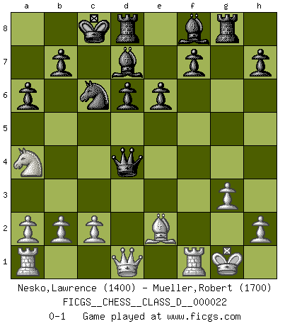 Last move : 0-1 2007 March 18 19:14:48 [Event "FICGS__CHESS__CLASS_D__000022"] [Site "FICGS"] [Date "2006.12.11"] [Round "1"] [White "Nesko,Lawrence"] [Black "Mueller,Robert"] [Result "0-1"] [WhiteElo "1400"] [BlackElo "1700"] 1.e4 c5 2.Nf3 Nc6 3.d4 cxd4 4.Nxd4 e6 5.Nc3 Nf6 6.Ndb5 d6 7.Bg5 a6 8.Nd4 Qa5 9.Bxf6 gxf6 10.Be2 Bd7 11.O-O Rg8 12.Nb3 Qg5 13.g3 O-O-O 14.Nd4 f5 15.f4 Qh4 16.Nf3 Qxf4 17.exf5 Qxf5 18.Nd4 Qc5 19.Na4 Qxd4+ 0-1 This chess game has been lost on time (started : 2006.12.11 20:7:37) Sicilian defense Kingside Castling by player White (move 11) Queenside Castling by player Black (move 13) Player Black won this chess game. Follow this game move after move (download)The tactician knows what to do when there is something to do; whereas the strategian knows what to do when there is nothing to do. (Gerald Abrahams) Es ist im Leben wie im Schachspiel. Wir entwerfen einen Plan, dieser bleibt jedoch bedingt durch das, was im Schachspiel dem Gegner, im Leben dem Schicksal zu tun belieben wird. (Arthur Schopenhauer) La táctica fluye a partir de una posición superior. (Bobby Fischer) Ne tendez aucun piège pour le plaisir ! Ne jouez rien dans l'espoir que l'adversaire réagisse de façon stupide ! Prenez toujours pour acquis que l'adversaire va trouver le meilleur coup ! Ne jouez jamais de coup dans l'espoir que l'adversaire ne voie pas la menace ! Chacun de vos coups doit améliorer la position d'une façon ou d'une autre. Even the best needles are not sharp at both ends. (Chinese proverb)