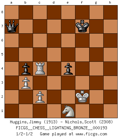 Last move : 1/2-1/2 2011 February 26 19:30:49 [Event "FICGS__CHESS__LIGHTNING_BRONZE__000193"] [Site "FICGS"] [Date "2011.02.26"] [Round "1"] [White "Huggins,Jimmy"] [Black "Nichols,Scott"] [Result "1/2-1/2"] [WhiteElo "1913"] [BlackElo "2308"] 1.e4 c5 2.Nf3 d6 3.d4 cxd4 4.Nxd4 Nf6 5.Nc3 g6 6.Be3 Bg7 7.f3 Nc6 8.Bc4 h5 9.Qe2 Bd7 10.O-O-O Na5 11.Bd3 a6 12.h3 e5 13.Nb3 b5 14.Qf2 Rb8 15.f4 b4 16.fxe5 dxe5 17.Na4 Nxb3+ 18.axb3 Qc7 19.Nb6 Bb5 20.Nc4 O-O 21.g4 Qc6 22.Rhg1 a5 23.gxh5 Nxh5 24.Nxa5 Qa8 25.Bxb5 Rxb5 26.Nc4 Nf6 27.Qh4 Rc8 28.Rd3 R5b8 29.Nd6 Rc6 30.Kd1 Qa1+ 31.Bc1 Qb1 32.Nc4 Rf8 33.Rf1 Nh5 34.Qg5 Nf4 35.Rd8 Ne6 36.Rxf8+ Bxf8 37.Qd2 Nd4 38.Rf2 Be7 39.Nxe5 Rd6 40.Nd3 Ne6 41.e5 Rd8 42.Rg2 Nc5 43.Ke2 Rd5 44.h4 Bxh4 45.Nxc5 Rxd2+ 46.Kxd2 Qa2 47.Na4 Qa1 48.Rg1 Bf2 49.e6 fxe6 50.Rxg6+ Kf7 51.Rg2 Be3+ 52.Kxe3 Qxc1+ 53.Kf3 e5 54.Nc5 Qf4+ 55.Ke2 Ke7 56.Rg7+ Kd6 57.Nd3 Qe4+ 58.Kd2 Qf5 59.Rg2 e4 60.Ne1 Ke5 61.Kd1 Qd7+ 62.Ke2 Qd4 63.Rg8 Qxb2 64.Re8+ Kd5 65.Rd8+ Ke6 66.Re8+ Kf5 67.Rf8+ Kg6 68.Rg8+ Kf7 69.Rc8 Qf6 70.Rc4 Qa6 71.Kf2 Qa7+ 1/2-1/2 Sicilian : Dragon, Yugoslav attack Queenside Castling by player White (move 10) Kingside Castling by player Black (move 20) 10 pieces endgame at move 52 : White KRNPPP , Black KQPP WHITE : King + 1 Rook 1 Knight 3 Pawns BLACK : King + 1 Queen 2 Pawns 9 pieces endgame at move 63 : White KRNPP , Black KQPP WHITE : King + 1 Rook 1 Knight 2 Pawns BLACK : King + 1 Queen 2 Pawns This chess game ended in a draw. Follow this game move after move (download)Later, I began to succeed in decisive games. Perhaps because I realized a very simple truth: not only was I worried, but also my opponent. (Mikhail Tal) Über die Verhaftung Bobby Fischers: Warum es die Bush-Administration für nötig befindet einen 61 Jahre alten Mann zu hetzten, der für niemanden ausser sich selbste eine Gefahr darstellt ist ein Rätsel. (Nigel Short) Cada Peón es una Reina en potencia. (James Mason) Même si l'adversaire joue le coup analysé précédemment, recommencez l'analyse en voyant la nouvelle position. Première règle de Blumenfeld A proverb is a short sentence based on long experience. (Miguel de Cervantes)