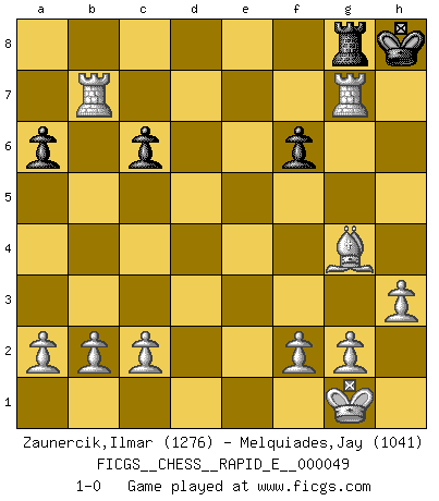 Last move : 1-0 2011 April 15 19:10:36 [Event "FICGS__CHESS__RAPID_E__000049"] [Site "FICGS"] [Date "2011.02.27"] [Round "1"] [White "Zaunercik,Ilmar"] [Black "Melquiades,Jay"] [Result "1-0"] [WhiteElo "1276"] [BlackElo "1041"] 1.e4 e5 2.Nf3 d6 3.d4 Nc6 4.dxe5 Bg4 5.exd6 Bxd6 6.Nc3 a6 7.Be2 Nf6 8.O-O h5 9.Re1 h4 10.h3 Bh5 11.Bg5 Ne5 12.Nxe5 Bxe5 13.Bxh5 O-O 14.Nd5 c6 15.Nxf6+ Bxf6 16.Bxf6 gxf6 17.Qg4+ Kh8 18.Qxh4 Qd6 19.Bg4 Kg7 20.e5 fxe5 21.Qg5+ Kh8 22.Qxe5+ Qxe5 23.Rxe5 f6 24.Re7 Rg8 25.Rxb7 Rg5 26.Re1 Rag8 27.R1e7 R5g7 28.Rxg7 1-0 Philidor's defense Kingside Castling by player White (move 8) Kingside Castling by player Black (move 13) Player White won this chess game. Follow this game move after move (download)Bobby just drops the pieces and they fall on the right squares. (Miguel Najdorf) Ich bewundere Kasparows phantasievolle Angriffssiege aus den Achtzigern und Neunzigern, aber wenn man sie mit dem Computer überprüft, nimmt der Computer in jeder zweiten Partie die Opfer an, verteidigt sich und gewinnt. (Vladimir Kramnik) Un entendimiento a fondo de las continuaciones típicas del mate, hace de las combinaciones de sacrificio mas complicadas conducirlas a ellas no solo sin dificultad, sino casi de una manera natural. (Siegbert Tarrasch) Je ne suis pas le dernier à jouer lâchement des coups douteux pendant le zeïtnot de l'adversaire pour l'achever: en effet les coups qui font le plus peur sont ceux que l'on ne comprend pas. Je me fais souvent peur quand je joue. (Un professeur anonyme) As the days dwindle down... to a precious few. (Maxwell Anderson)