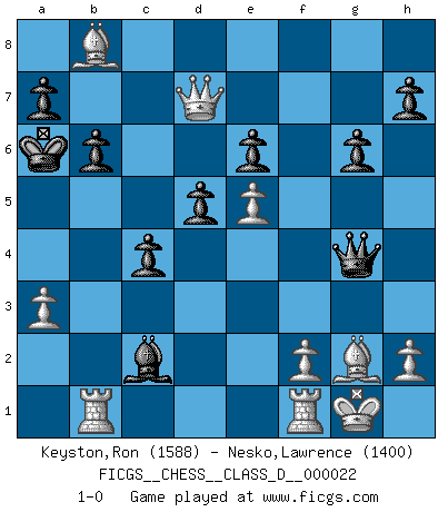 Last move : 1-0 2006 December 24 18:38:19 [Event "FICGS__CHESS__CLASS_D__000022"] [Site "FICGS"] [Date "2006.12.11"] [Round "1"] [White "Keyston,Ron"] [Black "Nesko,Lawrence"] [Result "1-0"] [WhiteElo "1588"] [BlackElo "1400"] 1.e4 e6 2.d4 d5 3.Nc3 Bb4 4.e5 c5 5.a3 Bxc3+ 6.bxc3 c4 7.Qg4 g6 8.Nf3 Qa5 9.Bd2 Nh6 10.Qh3 Nf5 11.g4 Nxd4 12.cxd4 Qb6 13.Bg2 Nc6 14.Qh6 Nxd4 15.O-O Bd7 16.Bg5 Ba4 17.Nxd4 Qxd4 18.Qg7 Rf8 19.Be3 Qxg4 20.Bc5 O-O-O 21.Bxf8 Bxc2 22.Be7 Kd7 23.Rab1 b6 24.Qxf7 Kc8 25.Bd6 Rd7 26.Qe8+ Kb7 27.Qxd7+ Ka6 28.Bb8 1-0 French : Winawer, Advance variation Kingside Castling by player White (move 15) Queenside Castling by player Black (move 20) Player White won this chess game. Follow this game move after move (download)At this time Fischer is simply a level above all the best Chessplayers in the world. (John Jacobs) Ich bin stolz ein Bulgare zu sein. (Veselin Topalov) Cuando la partida de Ajedrez termina, el Peón y el Rey regresan a la misma caja. (Irish saying) Des idées, des idées, j'en ai cent, j'en ai mille. Des bonnes, des mauvaises, applicables, irréalisables... Il suffit de faire le tri ! (Roos) Secret operations are essential in war; upon them the army relies to make its every move. (Sun Tzu)