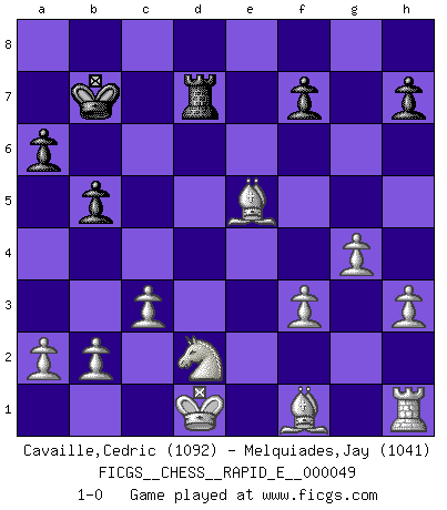 Last move : 1-0 2011 March 17 21:56:13 [Event "FICGS__CHESS__RAPID_E__000049"] [Site "FICGS"] [Date "2011.02.27"] [Round "1"] [White "Cavaille,Cedric"] [Black "Melquiades,Jay"] [Result "1-0"] [WhiteElo "1092"] [BlackElo "1041"] 1.e4 e5 2.Nf3 d6 3.Nc3 c6 4.d4 a6 5.dxe5 Nd7 6.exd6 Nc5 7.Ne5 Bxd6 8.Nc4 Nxe4 9.Nxe4 Qc7 10.Nexd6+ Kd7 11.Nxc8 Kxc8 12.Qd6 Qxd6 13.Nxd6+ Kc7 14.Nc4 Re8+ 15.Be3 Nf6 16.O-O-O Re7 17.Bd4 Ng4 18.Bxg7 Rg8 19.Bd4 Rd8 20.c3 R8d7 21.h3 c5 22.Bxc5 Rxd1+ 23.Kxd1 Rd7+ 24.Nd2 b6 25.f3 Ne5 26.Bd4 b5 27.Bxe5+ Kb7 28.g4 1-0 Philidor's defense Queenside Castling by player White (move 16) Player White won this chess game. Follow this game move after move (download)Chess is a terrible game. If you have no center, your opponent has a freer position. If you do have a center, then you really have something to worry about ! (Siegbert Tarrasch) Schach ist mein Leben, meine Leidenschaft, was ich gelernt habe und seit meinem 14. Lebensjahr profimässig praktiziere. Darauf zu verzichten, würde mir sehr schwer fallen. (Viktor Kortschnoi) El Ajedrez es una hermosa aventura. (Bent Larsen) Les échecs c'est le défi de l'alpiniste, toujours plus haut, prêt à tout pour monter à l'assaut du Roi ennemi. Les échecs, c'est de la musique en mouvement, un ballet majestueux pour les yeux. C'est de la poésie composée par les fantômes du passé qui au même titre que Rimbaud ou Verlaine méritent notre admiration. Les échecs, c'est de la peinture ou le moindre mouvement modifie le tableau pour en faire un Picasso ou un Van Gogh. Les échecs, c'est tout et rien, c'est la vie et la mort. Jjulie33 sur le forum de France-Echecs. If computers get too powerful, we can organize them into committees. That'll do them in. (Anonymous)