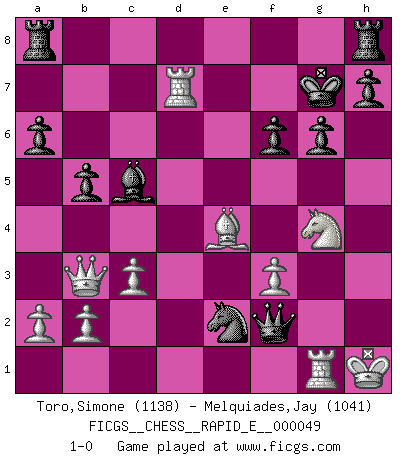 Last move : 1-0 2011 March 16 18:56:58 [Event "FICGS__CHESS__RAPID_E__000049"] [Site "FICGS"] [Date "2011.02.27"] [Round "1"] [White "Toro,Simone"] [Black "Melquiades,Jay"] [Result "1-0"] [WhiteElo "1138"] [BlackElo "1041"] 1.e4 e5 2.Nf3 d6 3.c3 a6 4.d4 f6 5.Bc4 Ne7 6.O-O b5 7.Bb3 c6 8.Re1 d5 9.dxe5 Bg4 10.Bf4 Nd7 11.h3 Bh5 12.e6 Nc5 13.Bc2 dxe4 14.Bxe4 Nxe6 15.Nbd2 Nxf4 16.Bxc6+ Kf7 17.Qb3+ Kg6 18.Be4+ Nf5 19.Bxf5+ Kh6 20.Nf1 Bxf3 21.gxf3 g6 22.Red1 Qc7 23.Rd7 Qc5 24.Be4 Nxh3+ 25.Kh1 Qxf2 26.Nh2 Nf4 27.Rg1 Bc5 28.R7d1 Ne2 29.Ng4+ Kg7 30.Rd7+ 1-0 Philidor's defense Kingside Castling by player White (move 6) Player White won this chess game. Follow this game move after move (download)Do you realize Fischer almost never has any bad pieces? He exchanges them, and the bad pieces remain with his opponents. (Yuri Balashov) Wenn Spassky eine Figur opfert kannst du genauso gut aufgeben. Aber wenn Tal eine Figur opfert, spiel weiter. Er könnte noch eine weitere opfern, und dann ... wer weiß? (Miguel Najdorf) Aquel que toma al Peón de Caballo de la Reina, se pasará la noche a dormir en la calle. (Anónimo) Même un GMI sait rarement calculer sur plus de cinq coups une attaque à sacrifices. (Rudolf Spielmann) You lose, general Kenobi. (General Grievous in Star Wars ep.3)