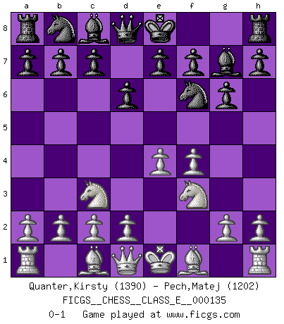 Last move : 0-1 2011 June 3 7:7:32 [Event "FICGS__CHESS__CLASS_E__000135"] [Site "FICGS"] [Date "2011.02.28"] [Round "1"] [White "Quanter,Kirsty"] [Black "Pech,Matej"] [Result "0-1"] [WhiteElo "1390"] [BlackElo "1202"] 1.e4 d6 2.f4 Nf6 3.Nc3 g6 4.Nf3 Bg7 0-1 This chess game has been lost on time (started : 2011.02.28 0:29:31) King's pawn Opening Player Black won this chess game. Follow this game move after move (download)The hardest game to win is a won game. (Emanuel Lasker) Karpov ist ein Museumsstück. (Garry Kasparov) Si tu oponente no puede hacer nada activo, entonces no apures la posición; En vez de eso, dejalo estar sentado ahí, sufriendo y rogandote por un empate. (Jeremy Silman) Aux échecs, l'amour-propre est satisfait quand on remporte la victoire, mais il n'y a pas de honte à être battu. (Benjamin Franklin) You think that education is too expensive ? Try ignorance. (Derek Bok)