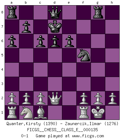 Last move : 0-1 2011 July 15 20:22:38 [Event "FICGS__CHESS__CLASS_E__000135"] [Site "FICGS"] [Date "2011.02.28"] [Round "1"] [White "Quanter,Kirsty"] [Black "Zaunercik,Ilmar"] [Result "0-1"] [WhiteElo "1390"] [BlackElo "1276"] 1.e4 e5 2.Nf3 Nc6 3.Bb5 a6 4.Bxc6 dxc6 5.O-O Bd6 6.d4 exd4 7.Qxd4 Ne7 8.Qxg7 Rg8 9.Qxh7 Bg4 10.Ng5 Be6 11.Nxe6 fxe6 12.Qh5+ Kd7 13.e5 Rh8 14.Qg5 Rg8 15.Qd2 Nf5 16.exd6 cxd6 0-1 This chess game has been lost on time (started : 2011.02.28 0:29:31) Ruy Lopez : Exchange variation, 5.O-O Kingside Castling by player White (move 5) Player Black won this chess game. Follow this game move after move (download)I am still a victim of Chess. It has all the beauty of art and much more. It cannot be commercialized. Chess is much purer than art in its social position. (Marcel Duchamp) Ich verstehe den Grund nicht, warum die Aufteilung in Frauen und Männer überhaupt im Schach besteht. (Judith Polgar) Los asuntos humanos son como una partida de Ajedrez: solo aquellos que no lo toman seriamente, pueden ser llamados buenos jugadores. (Hung Tzu Ch'eng) Mon pion favori sur ma case favorite ! Bronstein en parlant d'un coup de pion en h5 quand il avait les Noirs. You can think I'm wrong, but that's no reason to quit thinking. (Gregory House, House M.D.)