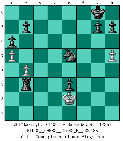 Last move : 0-1 2011 April 3 18:31:44 [Event "FICGS__CHESS__CLASS_E__000135"] [Site "FICGS"] [Date "2011.02.28"] [Round "1"] [White "Whittaker,Deon"] [Black "Barradas,Anderson"] [Result "0-1"] [WhiteElo "1400"] [BlackElo "1236"] 1.e4 c5 2.Nc3 e6 3.d3 Nc6 4.Nf3 a6 5.Be2 d6 6.d4 cxd4 7.Nxd4 Nxd4 8.O-O Nxe2+ 9.Qxe2 Be7 10.a4 Nf6 11.h3 O-O 12.e5 dxe5 13.Qxe5 Nd7 14.Qg3 Bh4 15.Qf3 Ne5 16.Qf4 Qf6 17.Ne4 Qxf4 18.Bxf4 Ng6 19.g3 Nxf4 20.gxh4 Nxh3+ 21.Kh2 e5 22.Nd6 Nf4 23.Nxc8 Raxc8 24.c3 Rfd8 25.Rad1 Nd3 26.Rd2 e4 27.f4 f5 28.Re2 Rc4 29.a5 Rd5 30.Ra1 Nxf4 31.Rf2 Nd3 32.Re2 f4 33.b4 e3 34.Kg2 Ne5 35.Rc1 f3+ 36.Kf1 fxe2+ 37.Kxe2 Rd3 38.Rd1 R4xc3 39.Rxd3 Rxd3 40.h5 Rb3 0-1 Sicilian : Closed Kingside Castling by player White (move 8) Kingside Castling by player Black (move 11) Player Black won this chess game. Follow this game move after move (download)Weak points or holes in the opponent's position must be occupied by pieces not Pawns. (Siegbert Tarrasch) Zu meiner Zeit war ein 20 jähriger ein junger Spieler, heute ist er ein Veteran. (Garry Kasparov) El Ajedrez, como cualquier otra actividad creativa, puede existir solo a través de méritos combinados de aquellos que tienen talento creativo y de aquellos que tienen la habilidad de organizar un trabajo creativo. (Mikhail Botvinnik) Le thème de l'attaque double intervient d'une manière ou d'une autre dans l'immense majorité des combinaisons. (Youri Averbakh) Macintosh - we might not get everything right, but at least we knew the century was going to end. (Douglas Adams)