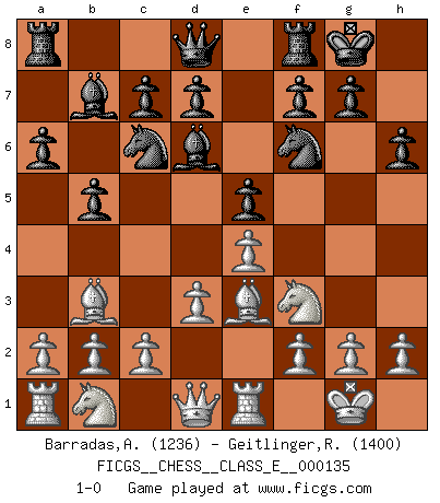 Last move : 1-0 2011 April 18 3:59:43 [Event "FICGS__CHESS__CLASS_E__000135"] [Site "FICGS"] [Date "2011.02.28"] [Round "1"] [White "Barradas,Anderson"] [Black "Geitlinger,Roger"] [Result "1-0"] [WhiteElo "1236"] [BlackElo "1400"] 1.e4 e5 2.Nf3 Nc6 3.Bb5 a6 4.Ba4 Bd6 5.O-O Nf6 6.Re1 b5 7.Bb3 O-O 8.d3 Bb7 9.Bg5 h6 10.Be3 1-0 This chess game has been lost on time (started : 2011.02.28 0:29:31) Ruy Lopez Kingside Castling by player White (move 5) Kingside Castling by player Black (move 7) Player White won this chess game. Follow this game move after move (download)Chess, like love, like music, has the power to make people happy. (Siegbert Tarrasch) Man braucht nicht immer den besten Zug zu spielen: Ein Zug muß aktiv, unternehmungslustig, korrekt und schön sein. (David Bronstein) El Ajedrez, como la música, como el amor, tiene el poder de hacer feliz a la gente. (Siegbert Tarrasch) J'ai toujours senti une vague pitié pour l'homme qui ne connaît rien aux échecs, tout comme j'en aurais pour un homme ignorant de l'amour. Les Echecs, comme la musique ou comme l'amour, ont le pouvoir de rendre heureux. (Siegbert Tarrasch) Your best chance to get a Royal Flush in a casino is in the bathroom. (Anonymous)