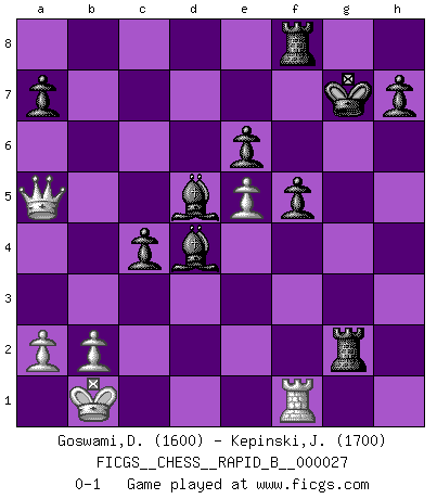 Last move : 0-1 2007 January 4 20:17:56 [Event "FICGS__CHESS__RAPID_B__000027"] [Site "FICGS"] [Date "2006.12.12"] [Round "1"] [White "Goswami,Deepjyoti"] [Black "Kepinski,Janusz"] [Result "0-1"] [WhiteElo "1600"] [BlackElo "1700"] 1.e4 e6 2.d4 d5 3.Nc3 Nf6 4.e5 Ne4 5.Nxe4 dxe4 6.Be3 c5 7.dxc5 Nd7 8.Bb5 Qa5+ 9.Qd2 Qxb5 10.O-O-O Bxc5 11.f4 O-O 12.Nh3 Be7 13.Nf2 Qc4 14.Kb1 b5 15.Qc1 Qc6 16.Rhe1 Bb7 17.Nxe4 Nxe5 18.fxe5 Qxe4 19.Bc5 Qxe1 20.Rxe1 Bxc5 21.g4 Rad8 22.h4 Rd4 23.h5 Rxg4 24.h6 Bd5 25.Rf1 f5 26.hxg7 Kxg7 27.c4 bxc4 28.Qe1 Bd4 29.Qa5 Rg2 0-1 French : Steinitz variation Queenside Castling by player White (move 10) Kingside Castling by player Black (move 11) Player Black won this chess game. Follow this game move after move (download)Examine moves that smite! A good eye for smites is far more important than a knowledge of strategical principles. (Purdy) Ich bin es gewohnt, das die Jugend mir überhaupt keinen Respekt entgegenbringt. (Alexander Morozewich) El Ajedrez te enseña a controlarl la excitación inicial que sientes cuando vez algo que parece bueno y te enseña a pensar objetivamente cuando te encuentras en problemas. (Stanley Kubrick) J'ai toujours senti une vague pitié pour l'homme qui ne connaît rien aux échecs, tout comme j'en aurais pour un homme ignorant de l'amour. Les Echecs, comme la musique ou comme l'amour, ont le pouvoir de rendre heureux. (Siegbert Tarrasch) There are lots of people who mistake their imagination for their memory. (Josh Bilings)