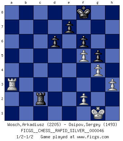 Last move : 1/2-1/2 2011 May 27 13:5:41 [Event "FICGS__CHESS__RAPID_SILVER__000046"] [Site "FICGS"] [Date "2011.02.28"] [Round "1"] [White "Wosch,Arkadiusz"] [Black "Osipov,Sergey"] [Result "1/2-1/2"] [WhiteElo "2205"] [BlackElo "1493"] 1.e4 c5 2.Nf3 d6 3.d4 cxd4 4.Nxd4 Nf6 5.Nc3 a6 6.Be3 Ng4 7.Bg5 h6 8.Bh4 g5 9.Bg3 Bg7 10.Be2 h5 11.Bxg4 hxg4 12.O-O Nc6 13.Nf5 Bxc3 14.bxc3 Qa5 15.Qxg4 f6 16.Qf3 Ne5 17.Bxe5 Qxe5 18.h3 Bd7 19.Rfd1 Rc8 20.Rd3 Kf7 21.Rb1 b5 22.Re3 Rc5 23.Rb4 Rc7 24.a3 Be6 25.a4 bxa4 26.Rxa4 a5 27.Ra1 Bd7 28.Rb1 Rc5 29.g4 Qf4 30.Qd1 Bxf5 31.exf5 Re5 32.Rxe5 Qxe5 33.Qd3 Rc8 34.c4 Qc5 35.Ra1 Qxc4 36.Qxc4+ Rxc4 37.Rxa5 Rxc2 38.Ra3 Kf8 1/2-1/2 Sicilian : Najdorf, Byrne (English) attack Kingside Castling by player White (move 12) This chess game ended in a draw. Follow this game move after move (download)Combinations have always been the most intriguing aspect of Chess. The masters look for them, the public applauds them, the critics praise them. It is because combinations are possible that Chess is more than a lifeless mathematical exercise. They are the poetry of the game; they are to Chess what melody is to music. They represent the triumph of mind over matter. (Reuben Fine) Oft bringt ein stiller Zug das Erdbeben. (Richard Reti) Tu no necesitas jugar muy bien, únicamente ayudar a tu oponenet a que juegue muy mal. (Genrikh Chepukaitis) Plusieurs personnes se sont demandées comment Tal faisait pour gagner... En fait, c'est très simple ! Il met ses pièces au centre de l'échiquier et les sacrifie quelque part ! (David Bronstein) Memory... is the diary that we all carry with us. (Oscar Wilde, The Importance of Being Earnest)