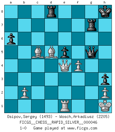 Last move : 1-0 2011 May 31 20:40:6 [Event "FICGS__CHESS__RAPID_SILVER__000046"] [Site "FICGS"] [Date "2011.02.28"] [Round "2"] [White "Osipov,Sergey"] [Black "Wosch,Arkadiusz"] [Result "1-0"] [WhiteElo "1493"] [BlackElo "2205"] 1.d4 Nf6 2.Nf3 g6 3.c4 Bg7 4.Nc3 O-O 5.e4 d6 6.Be2 e5 7.O-O Nc6 8.d5 Ne7 9.Ne1 Nd7 10.Be3 f5 11.f3 f4 12.Bf2 g5 13.Nd3 Nf6 14.c5 Ng6 15.Rc1 Rf7 16.a4 Bf8 17.Kh1 h5 18.a5 g4 19.Qe1 Bd7 20.a6 bxa6 21.Ra1 Bc8 22.Nb4 dxc5 23.Nc6 Qd7 24.Na4 h4 25.Nxc5 Bxc5 26.Bxc5 h3 27.g3 Nxd5 28.Nxa7 fxg3 29.Qxg3 Bb7 30.Rad1 Ngf4 31.Bc4 c6 32.Rg1 Rg7 33.Qh4 Qe6 34.Nxc6 Bxc6 35.exd5 Bxd5 36.Rxd5 Nxd5 37.Rd1 Rd7 38.Qh5 Rad8 39.Re1 Qf6 40.Qxg4+ Rg7 41.Qe4 Qg5 42.Bxd5+ Kh8 43.f4 1-0 King's Indian : East Indian defense Kingside Castling by player Black (move 4) Kingside Castling by player White (move 7) Player White won this chess game. Follow this game move after move (download)No other master has such a terrific will to win. At the board he radiates danger, and even the strongest opponents tend to freeze, like rabbits when they smell a panther. Even his weaknesses are dangerous. As white, his opening game is predictable - you can make plans against it - but so strong that your plans almost never work. In the middle game his precision and invention are fabulous, and in the end game you simply cannot beat him. (Anonymous German Expert) Sitze auf Deine Hände. (Siegbert Tarrasch) Los Peones son nacidos libres, y aún así, se encuentran por doquier encadenados. (Rick Kennedy) Les échecs sont un jeu terrible. Si vous n'avez pas le centre, votre adversaire a une position plus libre. Par contre, si vous avez le centre, alors vous avez vraiment quelque chose pour laquelle vous inquiéter ! (Siegbert Tarrasch) Animated gif is worth one mega-word. (Unknown)