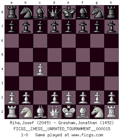 Last move : 1-0 2011 April 12 15:27:24 [Event "FICGS__CHESS__UNRATED_TOURNAMENT__000015"] [Site "FICGS"] [Date "2011.03.01"] [Round "1"] [White "Riha,Josef"] [Black "Gresham,Jonathan"] [Result "1-0"] [WhiteElo "2049"] [BlackElo "1492"] 1.c4 1-0 This chess game has been lost on time (started : 2011.03.01 15:11:31) English Opening Player White won this chess game. Follow this game move after move (download)When you absolutely don't know what to do anymore, it is time to panic. (John van der Wiel) Ich tröste mich mit dem Vergnügen, daß Schachfans, Zuschauer und Leser glücklich sind, wenn ein Großmeister etwas riskiert, statt nur Klötzchen zu schieben. (Mikhail Nekhemyevich Tal) Si pudieramos observar el interior de la cabeza de un jugador de Ajedrez, encontraríamos ahí un mundo lleno de sentimientos, imágenes, ideas, emoción y pasión. (Alfred Binet) Il n'y a pas eu de défaite parce que je ne crois pas que cet ordinateur ait jamais existé. IBM a triché en refusant d'imprimer les modes de recherche de la machine. C'est évident, pendant le match, des coups décisifs ont été joués par des êtres humains. Aujourd'hui, les meilleurs spécialistes en informatique ne peuvent toujours pas expliquer comment Deep-Blue a pu jouer contre la logique des ordinateurs. IBM a gagné une guerre de communication, mais ils sont incapables de prouver que l'ordinateur a gagné tout seul. (Garry Kasparov) You can only get smarter by playing a smarter opponent. (Revolver, movie)
