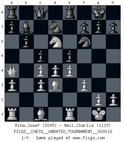 Last move : 1-0 2011 March 7 19:55:5 [Event "FICGS__CHESS__UNRATED_TOURNAMENT__000015"] [Site "FICGS"] [Date "2011.03.01"] [Round "1"] [White "Riha,Josef"] [Black "Neil,Charlie"] [Result "1-0"] [WhiteElo "2049"] [BlackElo "1119"] 1.d4 Nf6 2.c4 e6 3.Nc3 Bb4 4.a3 Bxc3+ 5.bxc3 O-O 6.f3 d6 7.e4 Nbd7 8.Bd3 b6 9.Ne2 Ba6 10.O-O c5 11.Qa4 Qc8 12.Ng3 Re8 13.Re1 e5 14.Nf5 Bb7 15.Nxd6 1-0 Nimzo-Indian : Saemisch variation Kingside Castling by player Black (move 5) Kingside Castling by player White (move 10) Player White won this chess game. Follow this game move after move (download)Everything is in a state of flux, and this includes the world of Chess. (Mikhail Botvinnik) Bobby Fischer ist kein Vorbild für die heutige Jugend. (Viktor Kortschnoi) El Ajedrez lo es todo: arte, ciencia y deporte. (Anatoly Karpov) Dieu déplace le joueur, et celui-ci la pièce. Quel Dieu derrière Dieu commence donc la trame ? Arturo Perez-Reverte (prix de littérature policière 1993). The best weapon against an enemy is another enemy. (Friedrich Nietzsche)