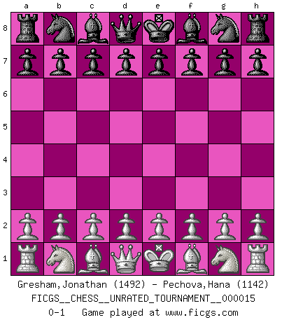 Last move : 0-1 2011 April 12 15:27:24 [Event "FICGS__CHESS__UNRATED_TOURNAMENT__000015"] [Site "FICGS"] [Date "2011.03.01"] [Round "1"] [White "Gresham,Jonathan"] [Black "Pechova,Hana"] [Result "0-1"] [WhiteElo "1492"] [BlackElo "1142"] 0-1 This chess game has been lost on time (started : 2011.03.01 15:11:31) Player Black won this chess game. Follow this game move after move (download)Methodical thinking is of more use in Chess than inspiration. (C. J. S. Purdy) Die Fehler sind da, Sie warten nur darauf gemacht zu werden. (Savielly Grigorievitsch Tartakower) Los Peones son el alma de una partida de Ajedrez. (Francois Andre Danican Philidor) C'est la seule position que je connaisse où les deux camps sont mals. Propos prêtés à V. Anand. He who laughs last probably does not get the joke. (Unknown)