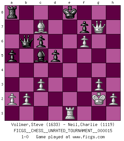 Last move : 1-0 2011 March 20 17:55:45 [Event "FICGS__CHESS__UNRATED_TOURNAMENT__000015"] [Site "FICGS"] [Date "2011.03.01"] [Round "1"] [White "Vollmer,Steve"] [Black "Neil,Charlie"] [Result "1-0"] [WhiteElo "1633"] [BlackElo "1119"] 1.e4 c5 2.Nf3 Nc6 3.d4 cxd4 4.Nxd4 Nf6 5.Nc3 e6 6.Nxc6 bxc6 7.e5 Nd5 8.Nxd5 exd5 9.Be2 Be7 10.O-O O-O 11.c3 d6 12.exd6 Bxd6 13.Be3 Qh4 14.f4 Bf5 15.Qd2 Rfe8 16.g3 Qh6 17.Bf3 Bh3 18.Bg2 Bxg2 19.Kxg2 Re4 20.Rae1 a5 21.f5 Qf6 22.Bg5 Qe5 23.Bf4 Qf6 24.Rxe4 h6 25.R4e1 Bc5 26.Be5 Qd8 27.f6 g5 28.Rf5 Qb6 29.Rxg5+ hxg5 30.Qxg5+ Kf8 31.Qg7+ Ke8 32.Bc7 1-0 Sicilian defense Kingside Castling by player White (move 10) Kingside Castling by player Black (move 10) Player White won this chess game. Follow this game move after move (download)I have always a slight feeling of pity for the man who has no knowledge of Chess. (Siegbert Tarrasch) Besser ein falscher Plan, logisch durchgeführt, als gar kein Plan. (Viktor Kortschnoi) Es muy difícil jugar en contra de la teoría de Einstein. - en su primera derrota en contra de Fischer (Mikhail Tal) Je ne crois pas en la psychologie, je crois aux bons coups. (Robert Fischer) Men never do evil so completely and cheerfully as when they do it from religious conviction. (Blaise Pascal)
