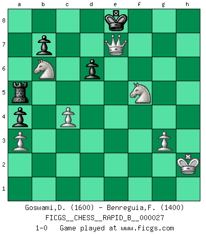 Last move : 1-0 2006 December 26 19:28:51 [Event "FICGS__CHESS__RAPID_B__000027"] [Site "FICGS"] [Date "2006.12.12"] [Round "1"] [White "Goswami,Deepjyoti"] [Black "Benreguia,Frederic"] [Result "1-0"] [WhiteElo "1600"] [BlackElo "1400"] 1.e4 e5 2.Nf3 Nf6 3.Nxe5 Nxe4 4.d4 Bd6 5.Bd3 Nf6 6.O-O O-O 7.c4 Na6 8.a3 c5 9.Nf3 Qc7 10.Bg5 cxd4 11.Bxf6 gxf6 12.Nh4 Bxh2+ 13.Kh1 Bf4 14.Qh5 h6 15.g3 Qc6+ 16.Kh2 Bg5 17.Nf5 Re8 18.f4 Nc5 19.fxg5 Nxd3 20.Nxh6+ Kh7 21.Nxf7 Kg7 22.gxf6+ Qxf6 23.Rxf6 Kxf6 24.Nd6 Re5 25.Qf3+ Ke6 26.Ne8 Ke7 27.Nc7 Ne1 28.Nd5+ Kd6 29.Qd1 d3 30.Nbc3 a5 31.Qg4 Nc2 32.Rd1 Nxa3 33.bxa3 Kc5 34.Na4+ Kd6 35.Rxd3 Kc6 36.Qd4 d6 37.Qb6+ Kd7 38.Qc7+ Ke8 39.Re3 Rxe3 40.Nxe3 Bd7 41.Nb6 a4 42.Qxd7+ Kf8 43.Nf5 Ra5 44.Qg7+ Ke8 45.Qe7+ 1-0 Petrov : Damiano variation Kingside Castling by player White (move 6) Kingside Castling by player Black (move 6) Player White won this chess game. Follow this game move after move (download)The defensive power of a pinned piece is only imaginary. (Aaron Nimzovich) Garry Kasparov war erst in der Großmeister-Organisation GMA, dann in der Profischach-Vereinigung PCA, zum Schluss kehrte er wieder in den Schoß der FIDE zurück. Aber gut, manche Leute sind flexibel (Viswanathan Anand) Te sientas frente a un tablero y repentinamente tu corazón brinca. Tu mano tiembla al tomar una pieza y moverla. Pero lo que el Ajedrez te enseña es que tu debes permanecer ahí con calma y pensar de que si realmente es una buena idea o de que si hay otras ideas mejores. (Stanley Kubrick) Ce n'est pas pour s'amuser qu'il joue aux échecs : il célèbre un culte. (Vladimir Nabokov) Bobby never cared about money, though. His only desire was to prove that his choices were correct: He wanted chess to be important because he was a chess player, and he wanted to be important. Bobby knew money was important, but he didn't have a clue why, outside of clothes and status. The only way he could accomplish what he wanted was to fight for a lot of money. Once he got it, he gave it away. He did not know how to spend it. And once he'd become champion, after, essentially, sacrificing his life for it, he didn't know how to spend his time. (Bob Wade)