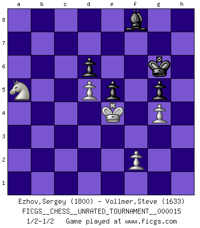Last move : 1/2-1/2 2011 April 1 20:9:9 [Event "FICGS__CHESS__UNRATED_TOURNAMENT__000015"] [Site "FICGS"] [Date "2011.03.01"] [Round "1"] [White "Ezhov,Sergey"] [Black "Vollmer,Steve"] [Result "1/2-1/2"] [WhiteElo "1800"] [BlackElo "1633"] 1.e4 e5 2.Nf3 Nc6 3.Bb5 a6 4.Ba4 Nf6 5.O-O b5 6.Bb3 Be7 7.Re1 d6 8.c3 O-O 9.h3 Na5 10.Bc2 c5 11.d4 cxd4 12.cxd4 Qc7 13.Nbd2 Bb7 14.d5 Nc4 15.Nf1 Rfc8 16.Ng3 Nxb2 17.Bxb2 Qxc2 18.Qxc2 Rxc2 19.Nf5 Bf8 20.Ba3 Ne8 21.Ne3 R2c8 22.Nd2 Rd8 23.Nf3 Rac8 24.Bb4 Ra8 25.Rec1 Rdc8 26.Rxc8 Rxc8 27.Kf1 g6 28.Ke2 Nf6 29.Nd2 Nd7 30.a4 bxa4 31.Rxa4 Nc5 32.Bxc5 Rxc5 33.Rc4 Rxc4 34.Nexc4 f5 35.Nb3 fxe4 36.Nb6 a5 37.Nxa5 Ba6+ 38.Nac4 Kf7 39.Ke3 Bxc4 40.Nxc4 g5 41.Kxe4 Kg6 42.Na5 h5 43.g4 hxg4 44.hxg4 1/2-1/2 Ruy Lopez : 5.O-O Kingside Castling by player White (move 5) Kingside Castling by player Black (move 8) 10 pieces endgame at move 44 : White KNPPP , Black KBPPP WHITE : King + 1 Knight 3 Pawns BLACK : King + 1 Bishop 3 Pawns This chess game ended in a draw. Follow this game move after move (download)Later, I began to succeed in decisive games. Perhaps because I realized a very simple truth: not only was I worried, but also my opponent. (Mikhail Tal) Stil? Ich habe keinen Stil! (Anatoly Karpov) La mitad de las variaciones que son calculadas en una partida de torneo, resultan ser completamente superfluas. Desafortunadamente, nadie sabe por adelantado cual mitad. (Jan Tinman) Karpov est une pièce de musée. (Garry Kasparov) Perfection is achieved, not when there is nothing more to add, but when there is nothing left to take away. (Antoine de Saint-Exupéry)