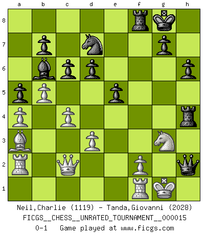 Last move : 0-1 2011 August 11 15:6:31 [Event "FICGS__CHESS__UNRATED_TOURNAMENT__000015"] [Site "FICGS"] [Date "2011.03.01"] [Round "1"] [White "Neil,Charlie"] [Black "Tanda,Giovanni"] [Result "0-1"] [WhiteElo "1119"] [BlackElo "2028"] 1.e4 c6 2.c4 e5 3.Nc3 Bc5 4.a3 d6 5.Be2 Qf6 6.Nf3 Ne7 7.d3 h6 8.b4 Bb6 9.O-O Bg4 10.h3 Bxf3 11.Bxf3 O-O 12.Bb2 Nd7 13.Qc2 Ng6 14.a4 a5 15.b5 Nf4 16.Bc1 Nxh3+ 17.gxh3 Qxf3 18.Kh2 f5 19.exf5 Rxf5 20.Ne4 Rh5 21.Ng3 Rh4 22.Ra2 Qg4 23.Kg2 Qxh3+ 24.Kf3 Qg4+ 25.Kg2 Rf8 26.Ba3 Qh3+ 27.Kg1 Qh2+ 0-1 Caro-Kann : Anti-Caro-Kann defense Kingside Castling by player White (move 9) Kingside Castling by player Black (move 11) Player Black won this chess game. Follow this game move after move (download)All I want to do, ever, is just play Chess. (Bobby Fischer) Ich habe die Schachforschung dermaßen betrieben, dass sie auf eine wissenschaftliche Basis gestellt wurde. (Mikhail Moiseyevich Botvinik) El Ajedrez es un cuento de Hadas de las 1001 metidas de pata. (Savielly Tartakower) La menace est plus forte que l'exécution. (Aaron Nimzovitch) There are two major products that came out of Berkeley: LSD and UNIX. We do not believe this is to be a coincidence. (Jeremy S. Anderson)