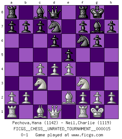 Last move : 0-1 2011 May 9 5:45:30 [Event "FICGS__CHESS__UNRATED_TOURNAMENT__000015"] [Site "FICGS"] [Date "2011.03.01"] [Round "1"] [White "Pechova,Hana"] [Black "Neil,Charlie"] [Result "0-1"] [WhiteElo "1142"] [BlackElo "1119"] 1.c4 Nf6 2.Nc3 g6 3.Nf3 Bg7 4.d4 d6 5.e4 O-O 6.Be2 e5 7.O-O Nbd7 0-1 This chess game has been lost on time (started : 2011.03.01 15:11:31) English Opening Kingside Castling by player Black (move 5) Kingside Castling by player White (move 7) Player Black won this chess game. Follow this game move after move (download)A strong memory, concentration, imagination, and a strong will is required to become a great Chess player. (Bobby Fischer) Früher wurde jeder komplizierte Zug, jedes interessante Opfer mit großem Beifall und Enthusiasmus aufgenommen. Heute schaltet man einfach seinen Fritz an, und man kann sehen, was los ist, ob der Zug geht oder nicht. (Vladimir Kramnik) Jugadores de primera clase pierden en contra de jugadores de segunda clase porque los jugadores de segunda clase a veces juegan una partida de primer clase. (Siegbert Tarrasch) Les Echecs mettent en conflit, non pas deux intelligences, mais deux volontés. (Lasker) Internal peace cannot coexist with external war. (Don Groves)