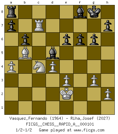 Last move : 1/2-1/2 2011 May 17 22:18:58 [Event "FICGS__CHESS__RAPID_A__000101"] [Site "FICGS"] [Date "2011.03.17"] [Round "1"] [White "Vasquez,Fernando"] [Black "Riha,Josef"] [Result "1/2-1/2"] [WhiteElo "1964"] [BlackElo "2027"] 1.e4 c5 2.d4 cxd4 3.c3 g6 4.cxd4 d5 5.exd5 Nf6 6.Be2 Nxd5 7.Nf3 Bg7 8.Nc3 O-O 9.Qb3 Nb6 10.O-O Be6 11.Qa3 Nc6 12.Be3 Nd5 13.Rac1 Qb6 14.Na4 Qb4 15.Nc5 Qxa3 16.bxa3 Nxe3 17.fxe3 Bd5 18.Rfd1 b6 19.Nd3 Bh6 20.Kf2 Rfc8 21.Nfe5 Nxe5 22.Nxe5 e6 23.Ba6 Rxc1 24.Rxc1 Bf8 25.Rc7 Bxa3 26.Nc4 Bf8 27.g3 Bb4 28.a4 f6 29.Bb5 Bf8 30.Ke2 1/2-1/2 Sicilian : Smith-Morra gambit Kingside Castling by player Black (move 8) Kingside Castling by player White (move 10) This chess game ended in a draw. Follow this game move after move (download)Botvinnik tried to take the mystery out of Chess, always relating it to situations in ordinary life. He used to call Chess a typical inexact problem similar to those which people are always having to solve in everyday life. (Garry Kasparov) Die Neutralität betrachte ich als eine schwere Krankheit. (Viktor Kortschnoi) El arma más poderosa en el Ajedrez, es tener la próxima movida. (David Bronstein) Avant la finale, les dieux ont créé le milieu de partie. (Tarrasch) This is where the fun begins. (Anakin Skywalker in Star Wars ep.3)