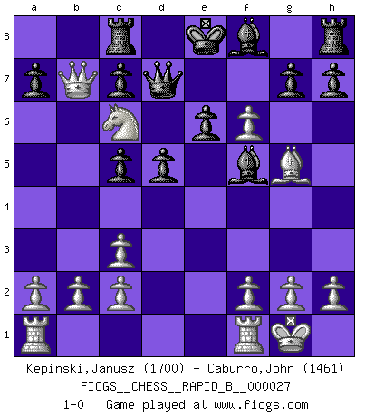 Last move : 1-0 2007 January 4 0:55:59 [Event "FICGS__CHESS__RAPID_B__000027"] [Site "FICGS"] [Date "2006.12.12"] [Round "1"] [White "Kepinski,Janusz"] [Black "Caburro,John"] [Result "1-0"] [WhiteElo "1700"] [BlackElo "1461"] 1.e4 Nf6 2.e5 Nd5 3.Nc3 Nxc3 4.dxc3 Nc6 5.Nf3 d5 6.Bb5 Bg4 7.O-O e6 8.Qd3 Bf5 9.Bxc6+ bxc6 10.Qa6 Qd7 11.Qb7 Rd8 12.Nd4 c5 13.Nc6 Rc8 14.Bg5 f6 15.exf6 1-0 Alekhine's defense : Saemisch attack Kingside Castling by player White (move 7) Player White won this chess game. Follow this game move after move (download)Later, I began to succeed in decisive games. Perhaps because I realized a very simple truth: not only was I worried, but also my opponent. (Mikhail Tal) Stil? Ich habe keinen Stil! (Anatoly Karpov) El Ajedrez tiene tanto misterio como las mujeres. (Purdy) Karpov est une pièce de musée. (Garry Kasparov) Always two there are. No more no less. A master, and an apprentice. (Master Yoda in Star Wars ep.1)