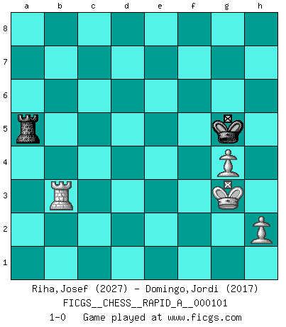 Last move : 1-0 2011 June 21 14:50:58 [Event "FICGS__CHESS__RAPID_A__000101"] [Site "FICGS"] [Date "2011.03.01"] [Round "1"] [White "Riha,Josef"] [Black "Domingo,Jordi"] [Result "1-0"] [WhiteElo "2027"] [BlackElo "2017"] 1.e4 e5 2.Nf3 f5 3.Nxe5 Qf6 4.d4 d6 5.Nc4 fxe4 6.Ne3 Nc6 7.c3 Qg6 8.Na3 Nf6 9.Nb5 Kd8 10.c4 Be7 11.Be2 Bd7 12.O-O h5 13.f3 h4 14.fxe4 h3 15.g3 Nxe4 16.Bd3 a6 17.Nxc7 Kxc7 18.Rf4 Raf8 19.Bxe4 Qe8 20.Nd5+ Kb8 21.Qd3 Qd8 22.Rb1 Bf6 23.Nxf6 Rxf6 24.Bd2 Re8 25.Rxf6 Qxf6 26.Bc3 Qg5 27.Rf1 Qg4 28.Bg6 Re7 29.a4 Kc7 30.c5 Qe2 31.Qxe2 Rxe2 32.Rf7 dxc5 33.dxc5 Ne5 34.Rf2 Re3 35.Ba5+ b6 36.cxb6+ Kb7 37.Rc2 Bxa4 38.Rc7+ Kb8 39.Rxg7 Nxg6 40.Rxg6 Re2 41.Rg8+ Kb7 42.Rg7+ Kc6 43.Rc7 Kd5 44.b4 Re8 45.Rh7 Ke4 46.Rxh3 Kf3 47.b5 axb5 48.Rh4 Bc2 49.Bd2 Ke2 50.Bb4 Bf5 51.Bd6 Bc8 52.Rh7 Rd8 53.b7 Bxb7 54.Rxb7 Rxd6 55.Rxb5 Kf3 56.Rb3+ Kg4 57.Rb4+ Kh5 58.Kg2 Rd2+ 59.Kh3 Rd5 60.g4+ Kg5 61.Rb3 Ra5 62.Kg3 1-0 Latvian : Nimzovich variation Kingside Castling by player White (move 12) 10 pieces endgame at move 47 : White KRBPPP , Black KRBP WHITE : King + 1 Rook 1 Bishop 3 Pawns BLACK : King + 1 Rook 1 Bishop 1 Pawn 9 pieces endgame at move 53 : White KRBPP , Black KRBP WHITE : King + 1 Rook 1 Bishop 2 Pawns BLACK : King + 1 Rook 1 Bishop 1 Pawn 8 pieces endgame at move 54 : White KRBPP , Black KRP WHITE : King + 1 Rook 1 Bishop 2 Pawns BLACK : King + 1 Rook 1 Pawn 7 pieces endgame at move 54 : White KRPP , Black KRP WHITE : King + 1 Rook 2 Pawns BLACK : King + 1 Rook 1 Pawn 6 pieces endgame at move 55 : White KRPP , Black KR WHITE : King + 1 Rook 2 Pawns BLACK : King + 1 Rook Player White won this chess game. Follow this game move after move (download)Pawns: they are the soul of this game, they alone form the attack and defense. (Philidor) Stil? Ich habe keinen Stil! (Anatoly Karpov) El Ajedrez es parte de una cultura y si una cultura esta en decadencia, entonces también el Ajedrez declinará. (Mikhail Botvinnik) Seul un grand joueur sait à quel point il joue faiblement. (Xavier Tartacover) Man is reluctant to give credit for intelligence to anyone, except his enemies. (Albert Einstein)