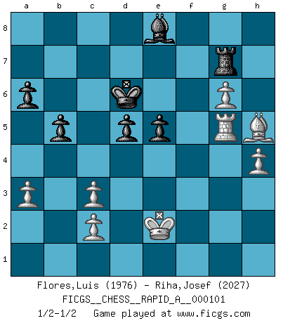 Last move : 1/2-1/2 2011 April 19 19:17:41 [Event "FICGS__CHESS__RAPID_A__000101"] [Site "FICGS"] [Date "2011.03.01"] [Round "1"] [White "Flores,Luis"] [Black "Riha,Josef"] [Result "1/2-1/2"] [WhiteElo "1976"] [BlackElo "2027"] 1.e4 c5 2.Nf3 d6 3.d4 cxd4 4.Nxd4 Nf6 5.Nc3 a6 6.Bg5 e6 7.f4 Qc7 8.Bxf6 gxf6 9.Qd2 Nc6 10.O-O-O Bd7 11.Kb1 O-O-O 12.Be2 h5 13.Rhf1 Kb8 14.Nxc6+ Bxc6 15.Qe3 Qa5 16.f5 Be7 17.Qh3 Qe5 18.Bxh5 Rdf8 19.g4 Bd8 20.a3 Ba5 21.Rfe1 Rhg8 22.Ka2 Rg7 23.Qd3 Bxc3 24.Qxc3 Qxc3 25.bxc3 d5 26.e5 fxe5 27.Rxe5 Kc7 28.h3 Kd6 29.Rde1 Bd7 30.fxe6 fxe6 31.g5 Rfg8 32.h4 Rh8 33.g6 Rf8 34.Rg5 Rf6 35.Kb2 b5 36.Kc1 Be8 37.Re3 Rg8 38.Kd2 Rg7 39.Re1 Rf2+ 40.Re2 Rf6 41.Ke3 Rf1 42.Rf2 Rxf2 43.Kxf2 e5 44.Ke3 Rg8 45.Ke2 Rg7 1/2-1/2 Sicilian : Najdorf, 7.f4 Queenside Castling by player White (move 10) Queenside Castling by player Black (move 11) This chess game ended in a draw. Follow this game move after move (download)There is only one thing Fischer does in Chess without pleasure: to lose ! (Boris Spassky) Fallen sollten polizeilich verboten werden. (Savielly Grigorievitsch Tartakower) Mi estilo es algo parecido entre un poco de Tal y Petrosian. (Reshevsky) Ne tendez aucun piège pour le plaisir ! Ne jouez rien dans l'espoir que l'adversaire réagisse de façon stupide ! Prenez toujours pour acquis que l'adversaire va trouver le meilleur coup ! Ne jouez jamais de coup dans l'espoir que l'adversaire ne voie pas la menace ! Chacun de vos coups doit améliorer la position d'une façon ou d'une autre. If you are going through hell, keep going. (Winston Churchill)